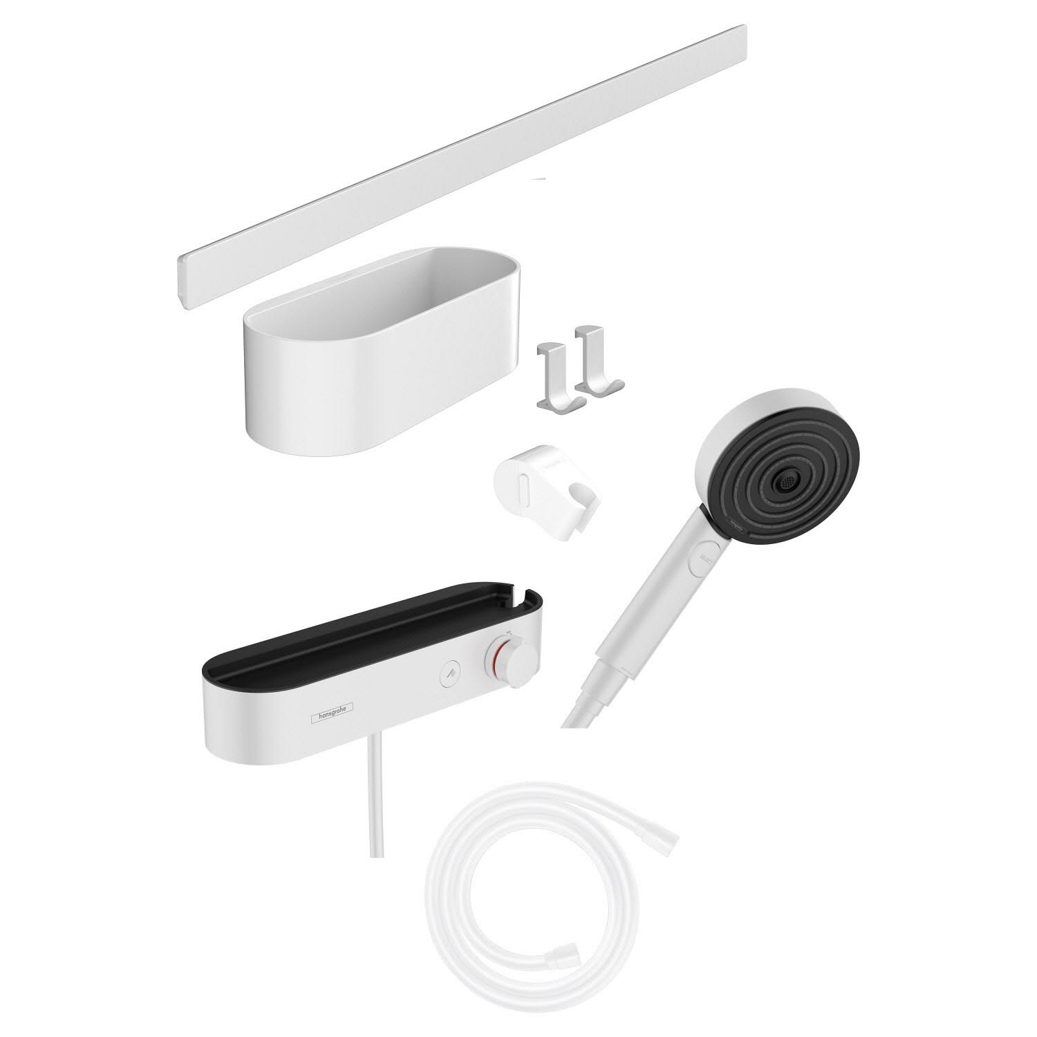 hansgrohe WallStoris Bundle Duschkopf 105, wassersparend, Thermostat, Duschstange 70 cm und Accessoireset