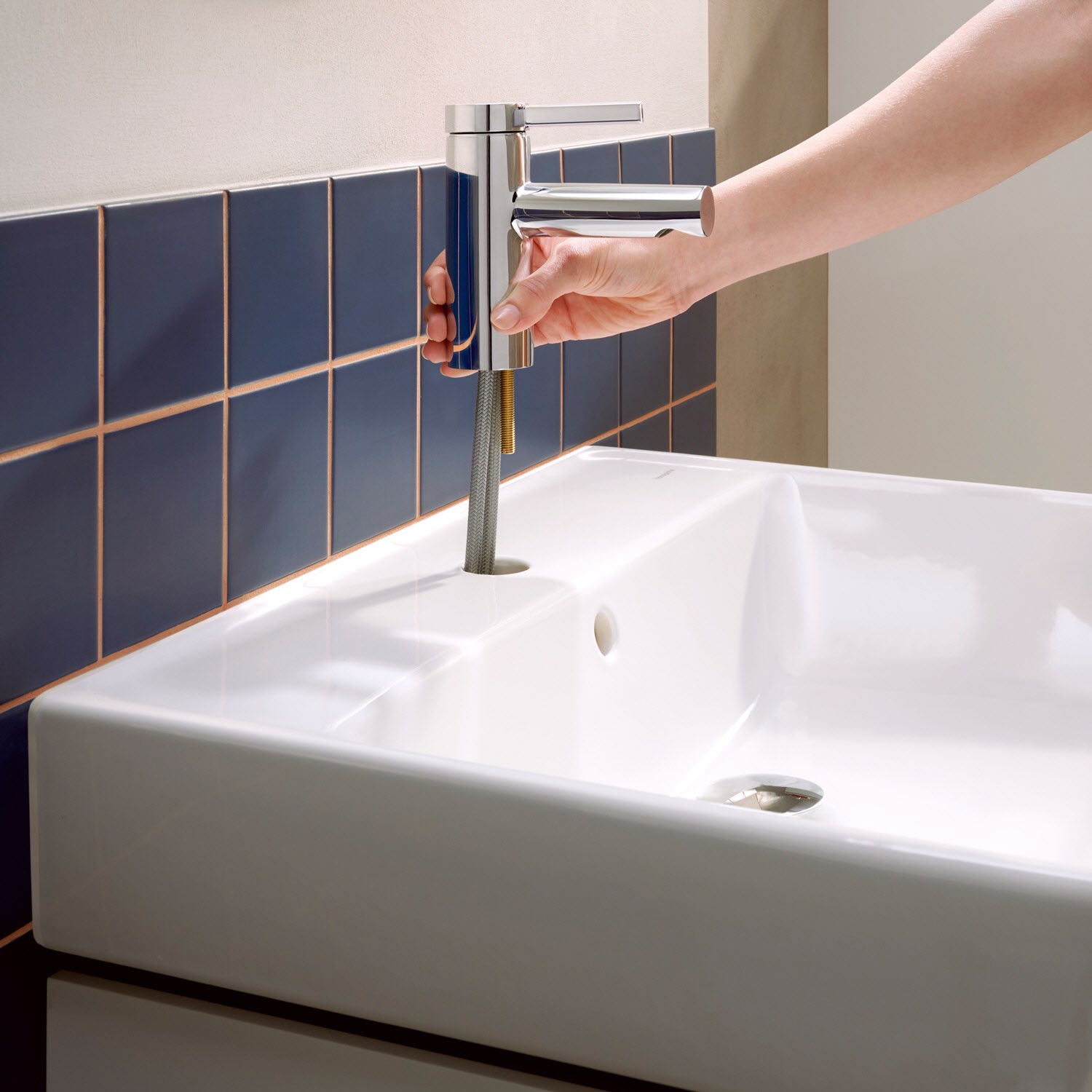 - Lieferumfang: Zugstangen-Ablaufgarnitur, Schaftbefestigung, Anschlussschläuche, Montageanleitung und Einhebel-Waschtischmischer