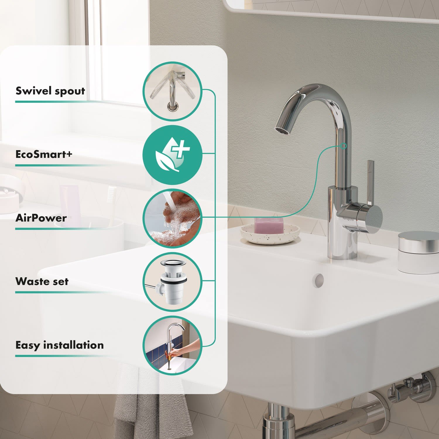 Tipp: Kombinieren Sie die Waschtischarmatur mit weiteren Produkten von hansgrohe, um ein harmonisches Gesamtbad zu gestalten.
