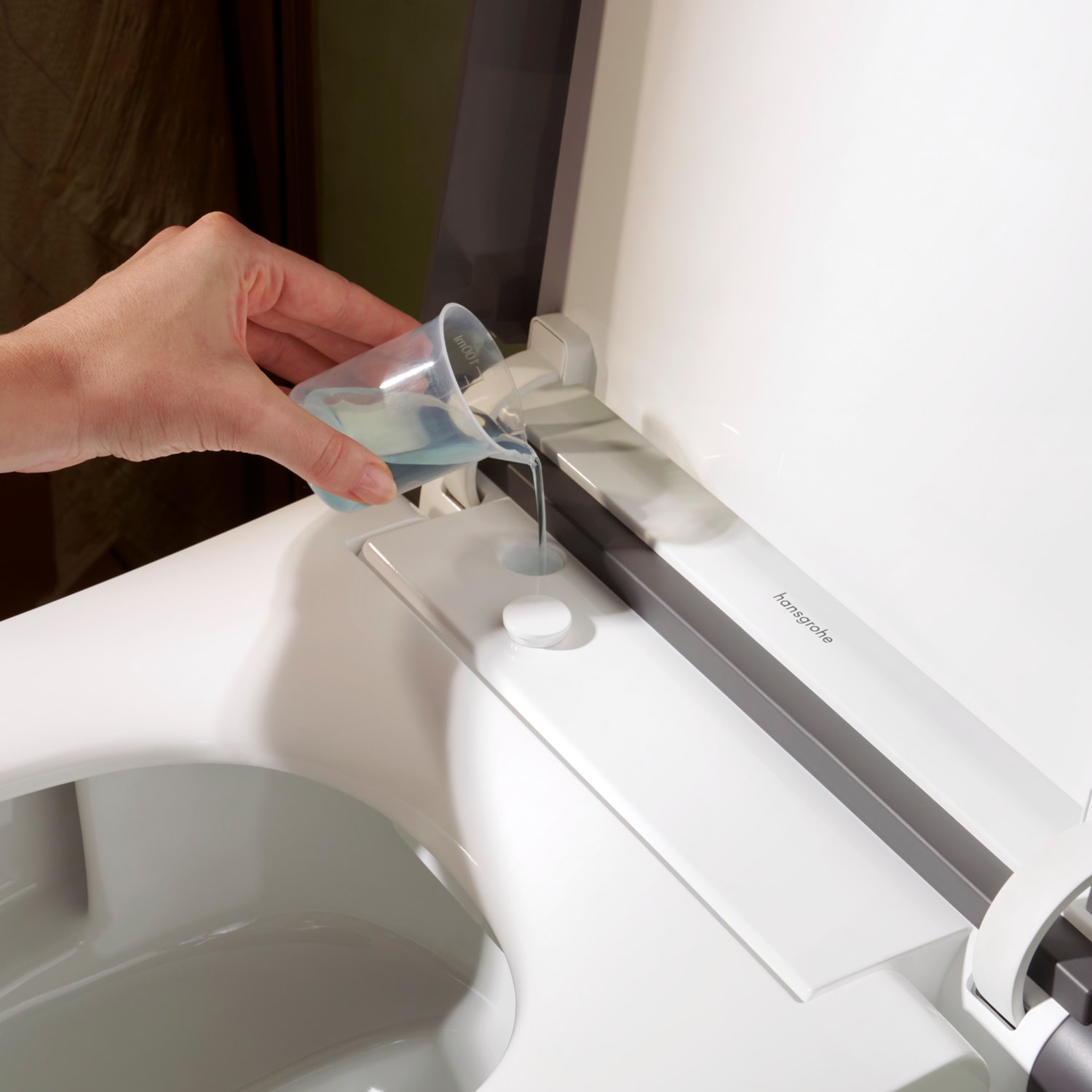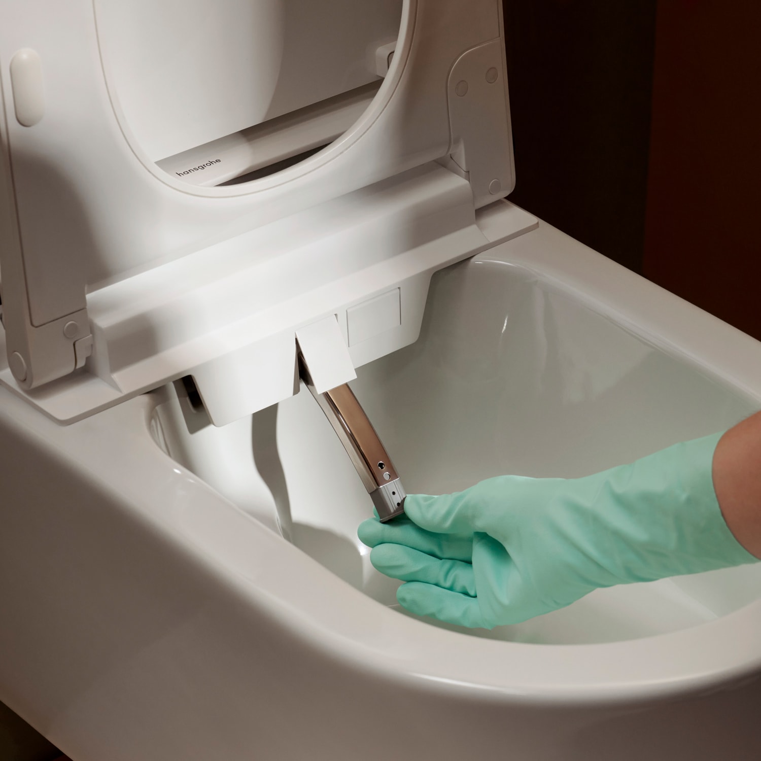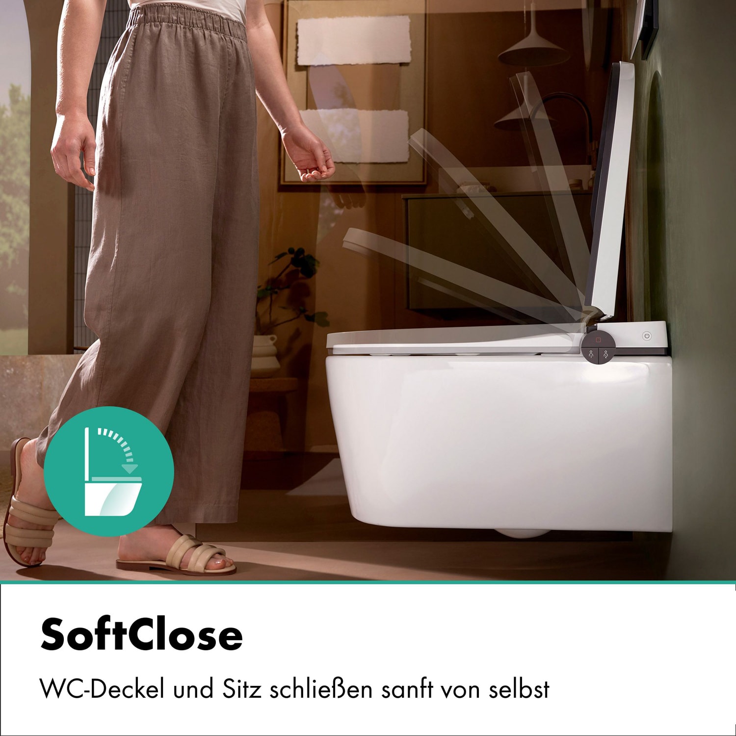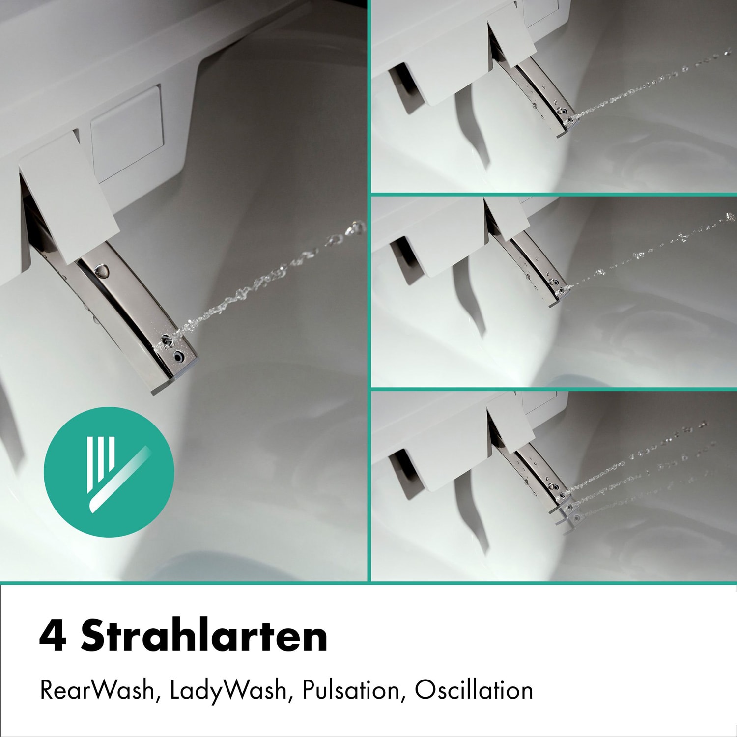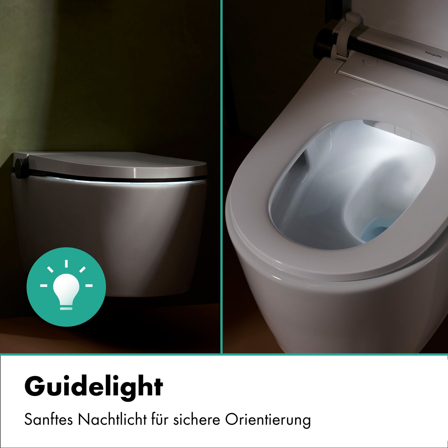 Einfach sauberer Ihr neues hansgrohe Dusch-WC verwöhnt mit vielen Komfort- und Hygiene-Funktionen: Warmes Wasser zur Reinigung, Warmluft zur Trocknung, beheizter sowie automatisch öffnender und schließender WC-Sitz, Geruchsabsaugung, ein Nachtlicht und eine innovative 2-in-1-Glasur mit HygieneEffect (Bezieht sich ausschließlich auf folgende Bakterien: Escherichia coli ATCC8739 und Salmonella enterica ATCC 13076 (Test gemäß ISO 22196: 2011-08 durchgeführt) und SmartClean. Dazu kommt eine kraftvolle Spülung dank AquaHelix Flush, ein UV-Licht und ein Edelstahl-Duschstab mit perfekt abgestimmten hansgrohe Duschprogrammen. Aber ... Sie wollen eigentlich nur zur Toilette? Ja, das geht auch! Nur besser.
