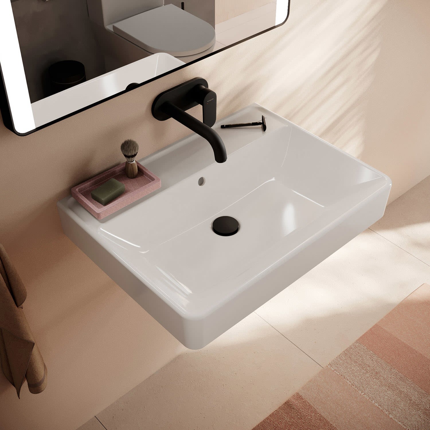 - ohne Hahnloch – für wandmontierte oder freistehende Armaturen geeignet