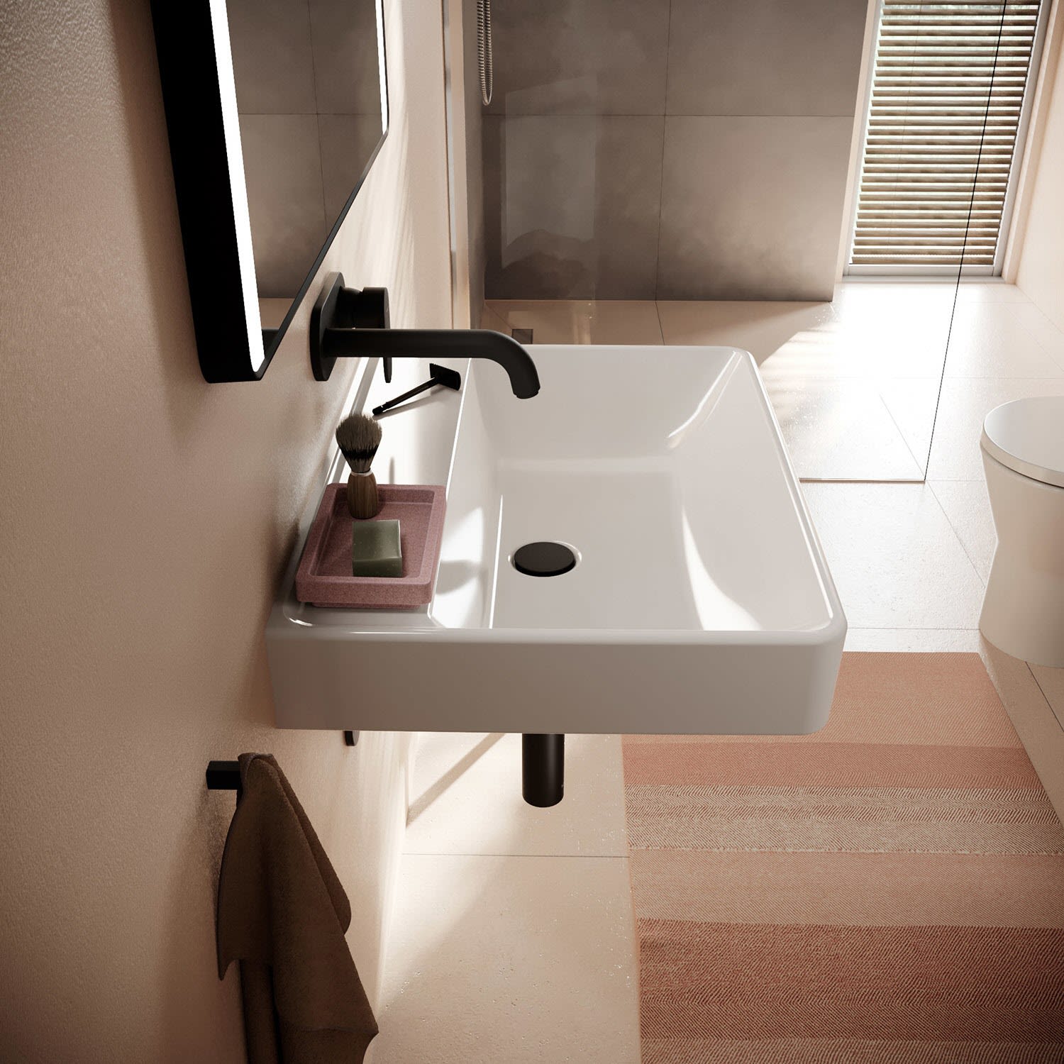 - ohne Hahnloch – für wandmontierte oder freistehende Armaturen geeignet