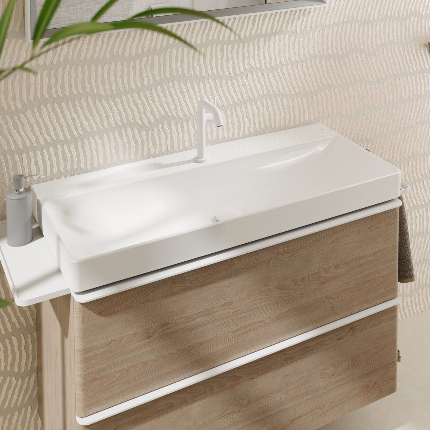 Für ein harmonisches Bad-Ambiente kombinieren Sie das Waschbecken mit einem perfekt auf das Design abgestimmten Badmöbel von hansgrohe. Alternativ lässt sich die Keramik auch frei an der Wand montieren.