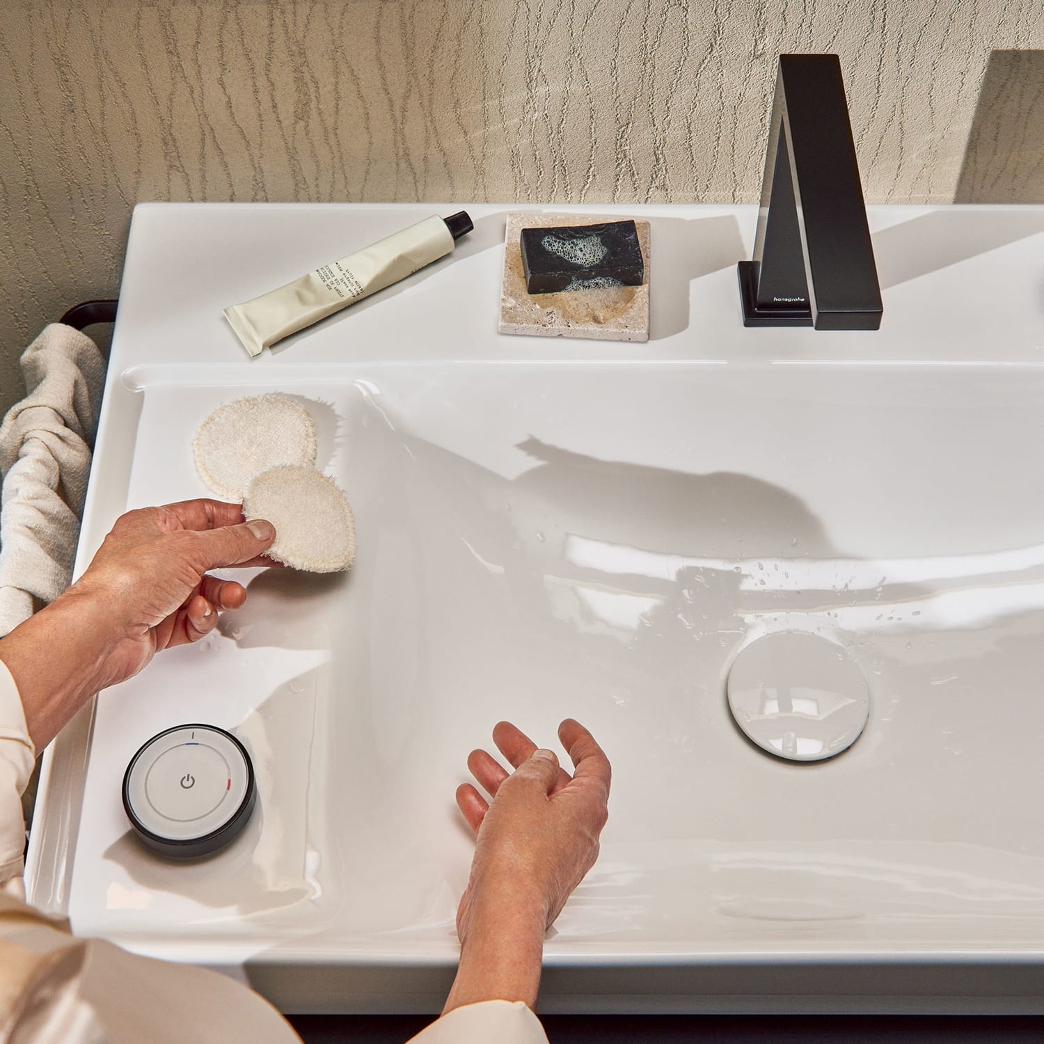 Tipp: Für ein vollendetes Design bietet sich die separat erhältliche unverschließbare Ablaufgarnitur von hansgrohe mit einer auf das Becken abgestimmten Keramikabdeckung an (siehe Zubehör).