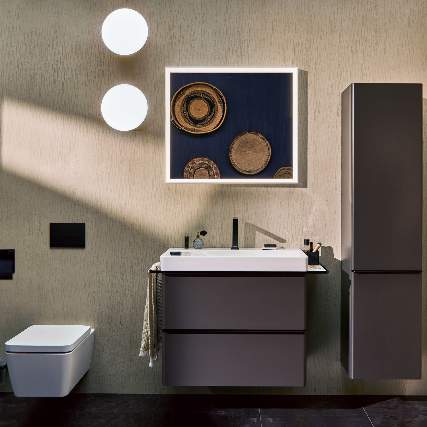 Für ein harmonisches Bad-Ambiente kombinieren Sie das Waschbecken mit einem perfekt auf das Design abgestimmten Badmöbel von hansgrohe. Alternativ lässt sich die Keramik auch frei an der Wand montieren.