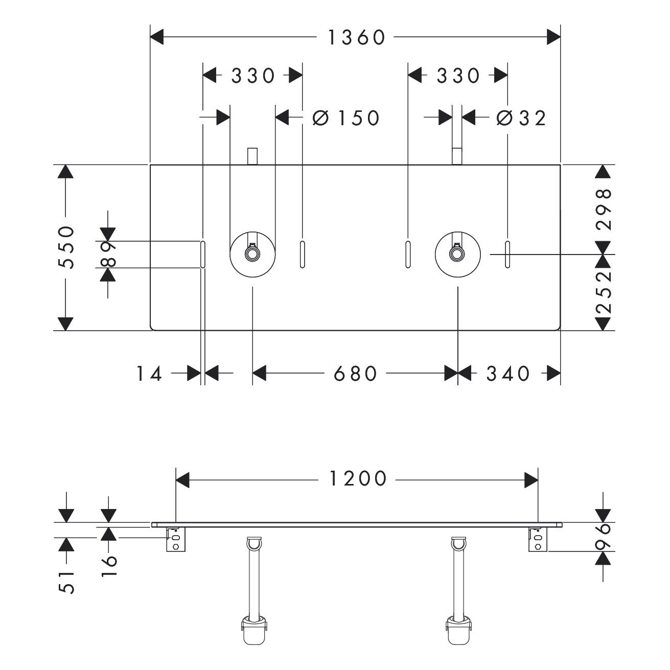 hansgrohe Xelu Q Konsole mit 2 Ausschnitten 136 x 55 cm, für Aufsatzwaschtisch ohne Hahnloch