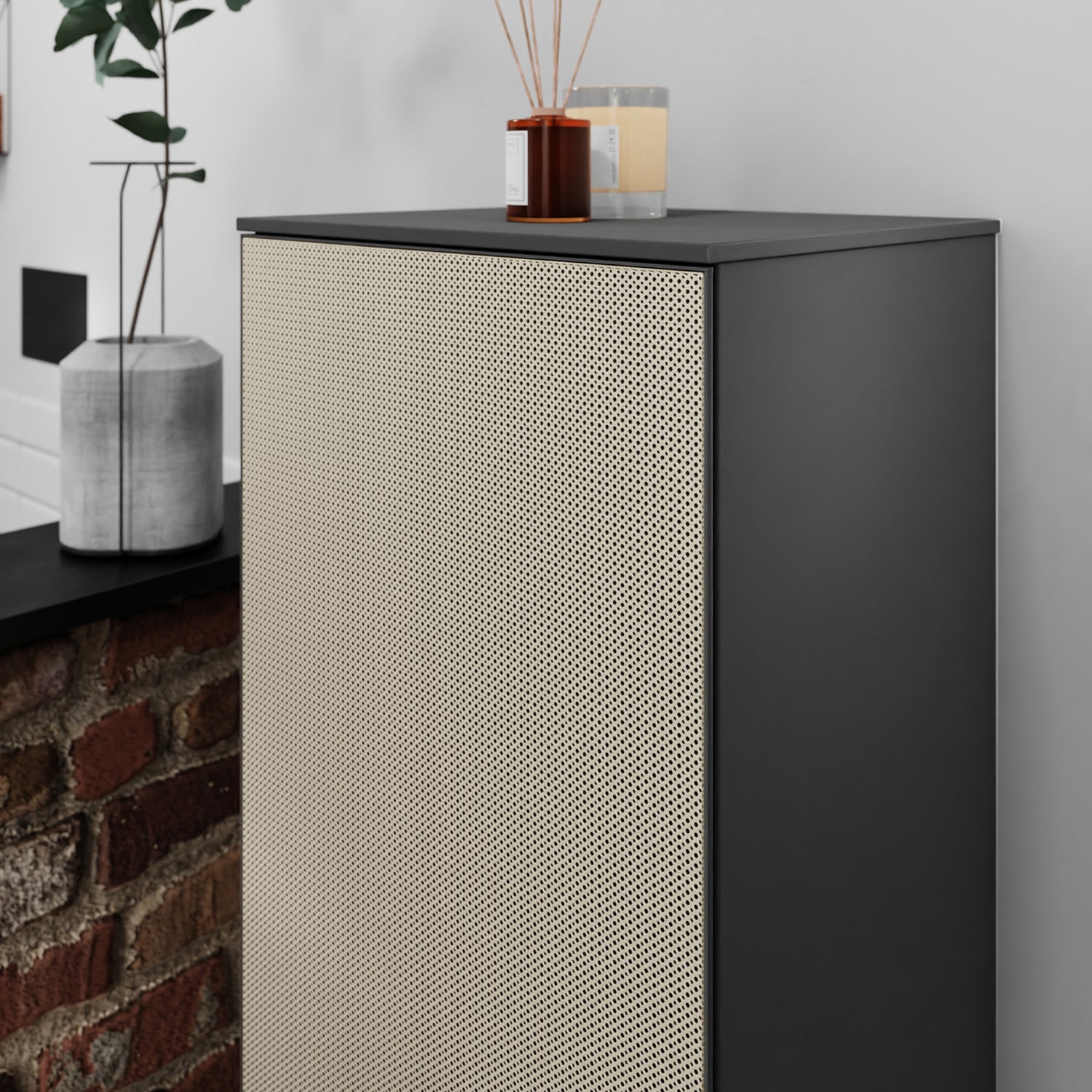 - Hinweise: Aluminiumrahmen in Korpusfarbe ermöglicht einfaches Wechseln der Fronten