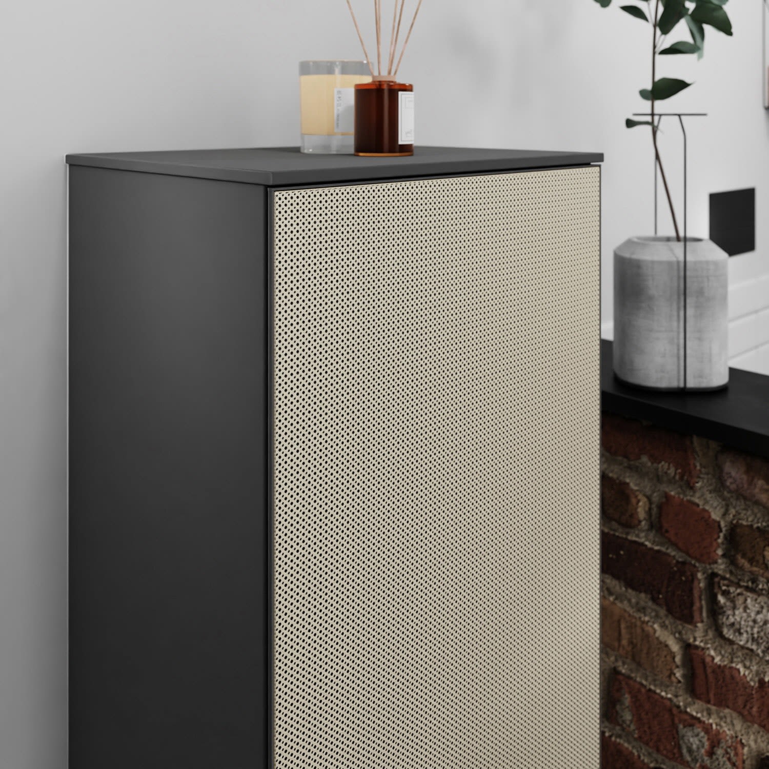 - Hinweise: Aluminiumrahmen in Korpusfarbe ermöglicht einfaches Wechseln der Fronten