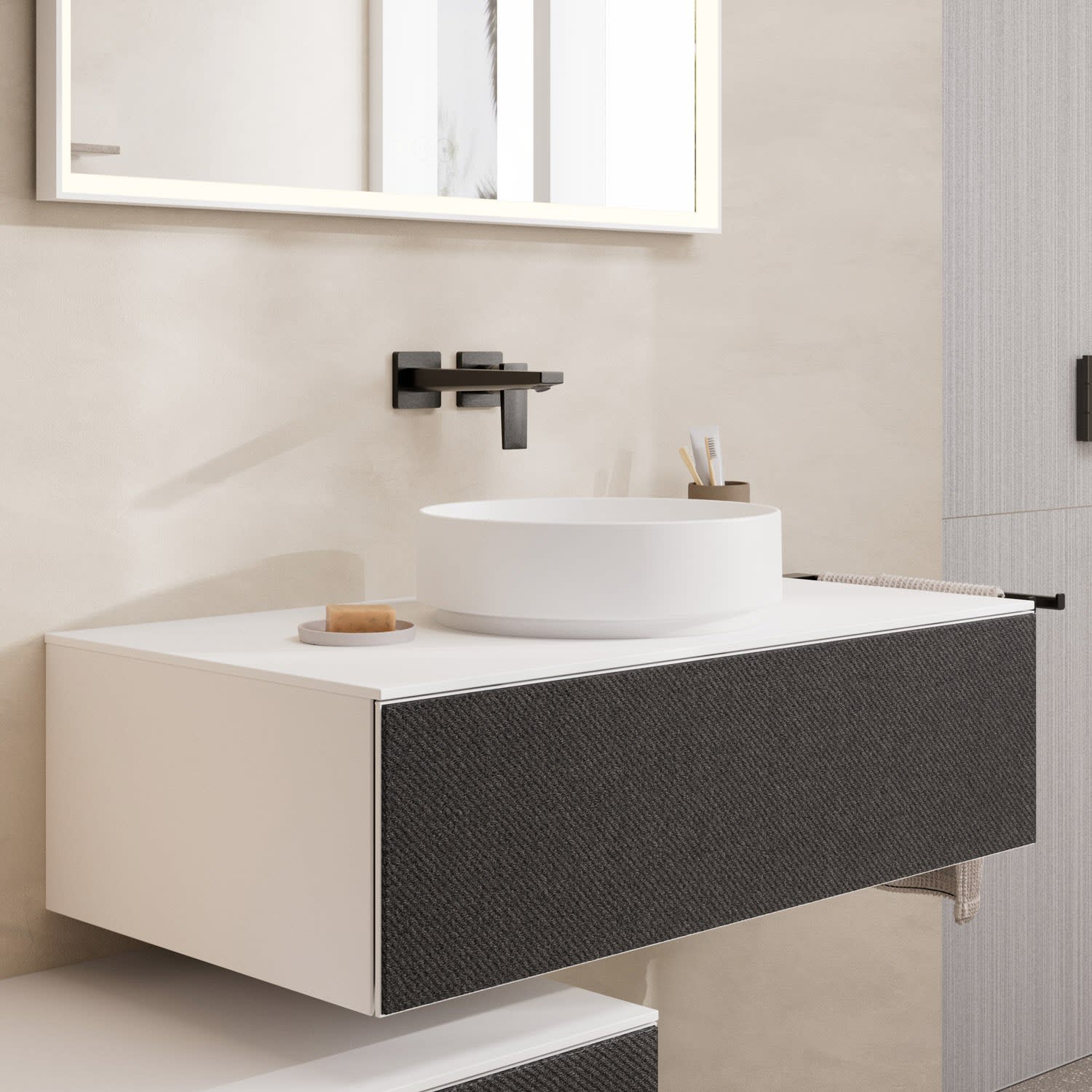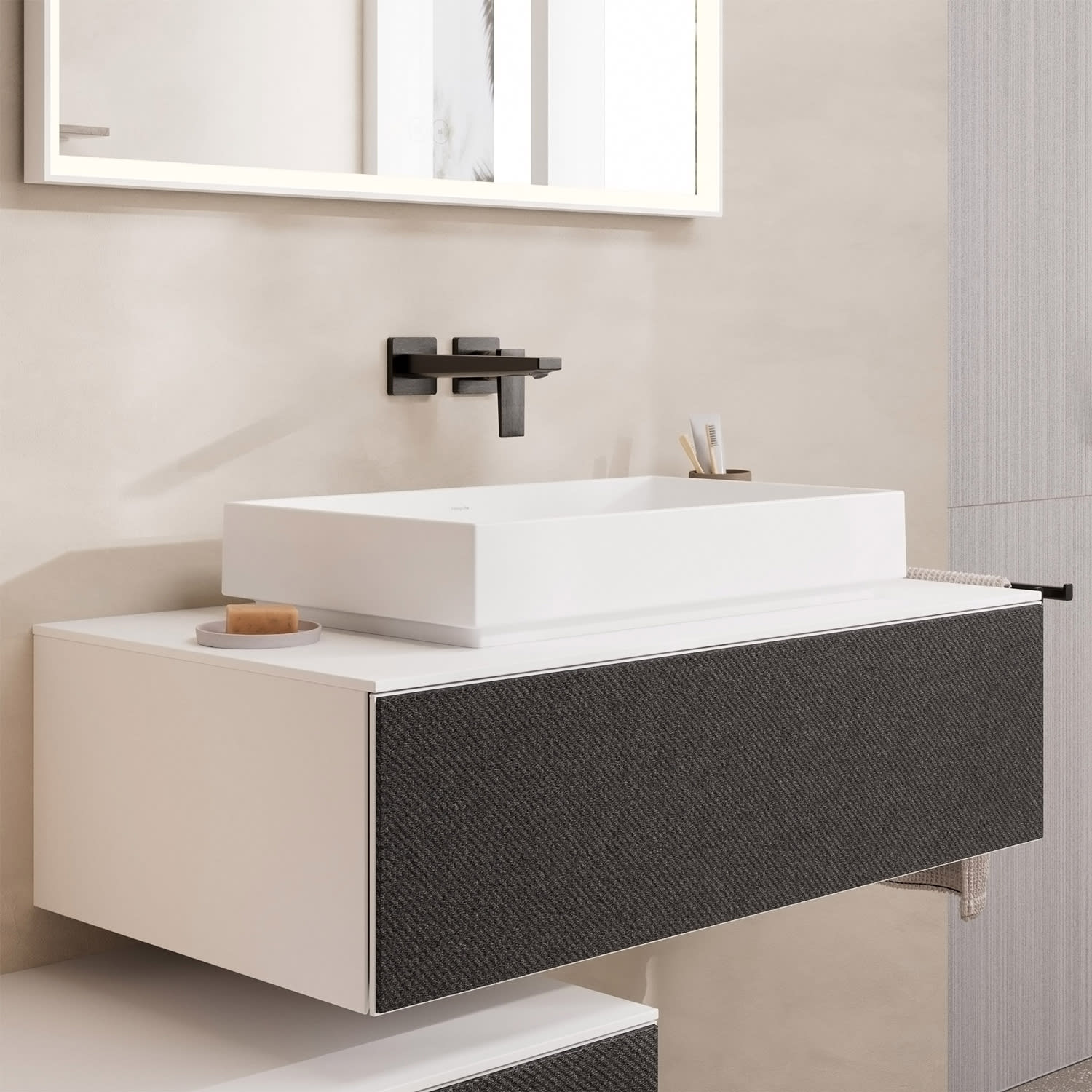 Mit Xevolos von hansgrohe verwirklichen Sie Ihre Vorstellung von einem perfekten Badezimmer. Einem Raum, in dem sich Ihre Persönlichkeit widerspiegelt. Diese Konsole verfügt über einen Ausschnitt für ein Aufsatzwaschbecken ohne Hahnloch. Sie wird mit einem Unterschrank kombiniert und erzeugt im Ergebnis ein architektonisches Design, das schnelllebige Moden überdauert und in die Zukunft weist. Der Farbton ist dabei exakt auf die Oberfläche der Xevolos Badmöbel abgestimmt.