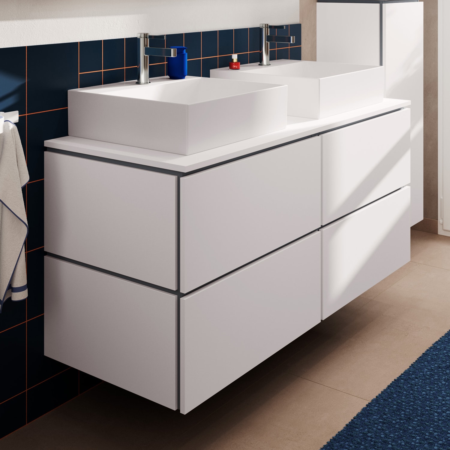 Entdecken Sie ein außergewöhnliches Design-Highlight für Ihr Bad, das nicht die Welt kostet. Mit Badmöbeln der hansgrohe Serie Xilesa E gestalten Sie im Handumdrehen Ihre persönliche Wohlfühloase. Die angebotene Waschtisch-/Konsolenplatte wird mit einem passenden Unterschrank und zwei geschliffenen Aufsatzwaschtischen von hansgrohe kombiniert.