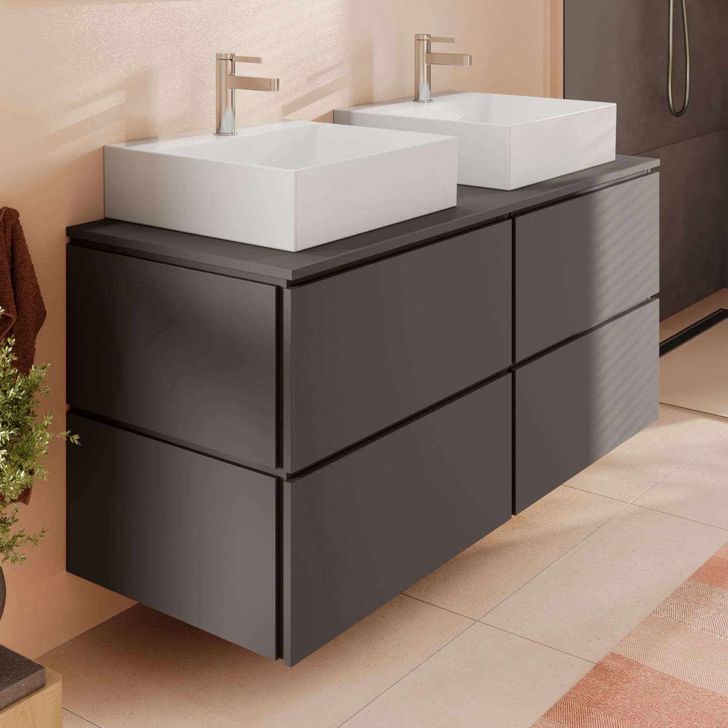 Entdecken Sie ein außergewöhnliches Design-Highlight für Ihr Bad, das nicht die Welt kostet. Mit Badmöbeln der hansgrohe Serie Xilesa E gestalten Sie im Handumdrehen Ihre persönliche Wohlfühloase. Die angebotene Waschtisch-/Konsolenplatte wird mit einem passenden Unterschrank und zwei geschliffenen Aufsatzwaschtischen von hansgrohe kombiniert.