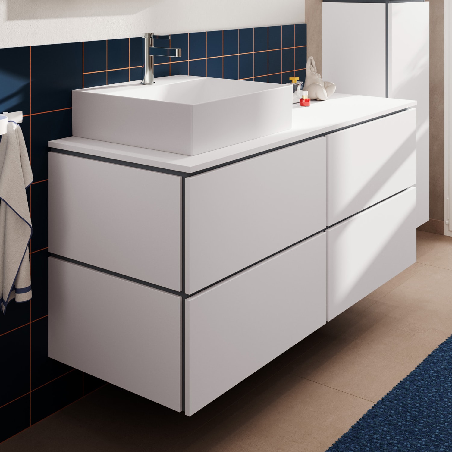Die Waschtisch-/Konsolenplatte selbst besteht aus einer hochdichten Dreischichtholzspanplatte und ist wie alle hansgrohe Badmöbel hervorragend für die feuchte Umgebung im Bad geeignet. Tipp: Mit der hansgrohe Möbelserie Xilesa E können Sie Ihr Bad ganz nach Ihren Vorstellungen einrichten. Denn es gibt die Waschtisch-/Konsolenplatte in verschiedenen Varianten – auf Wunsch auch für eine ungeschliffene Waschschüssel, mit zwei Ausschnitten oder mit einem Ausschnitt auf der rechten Seite.
