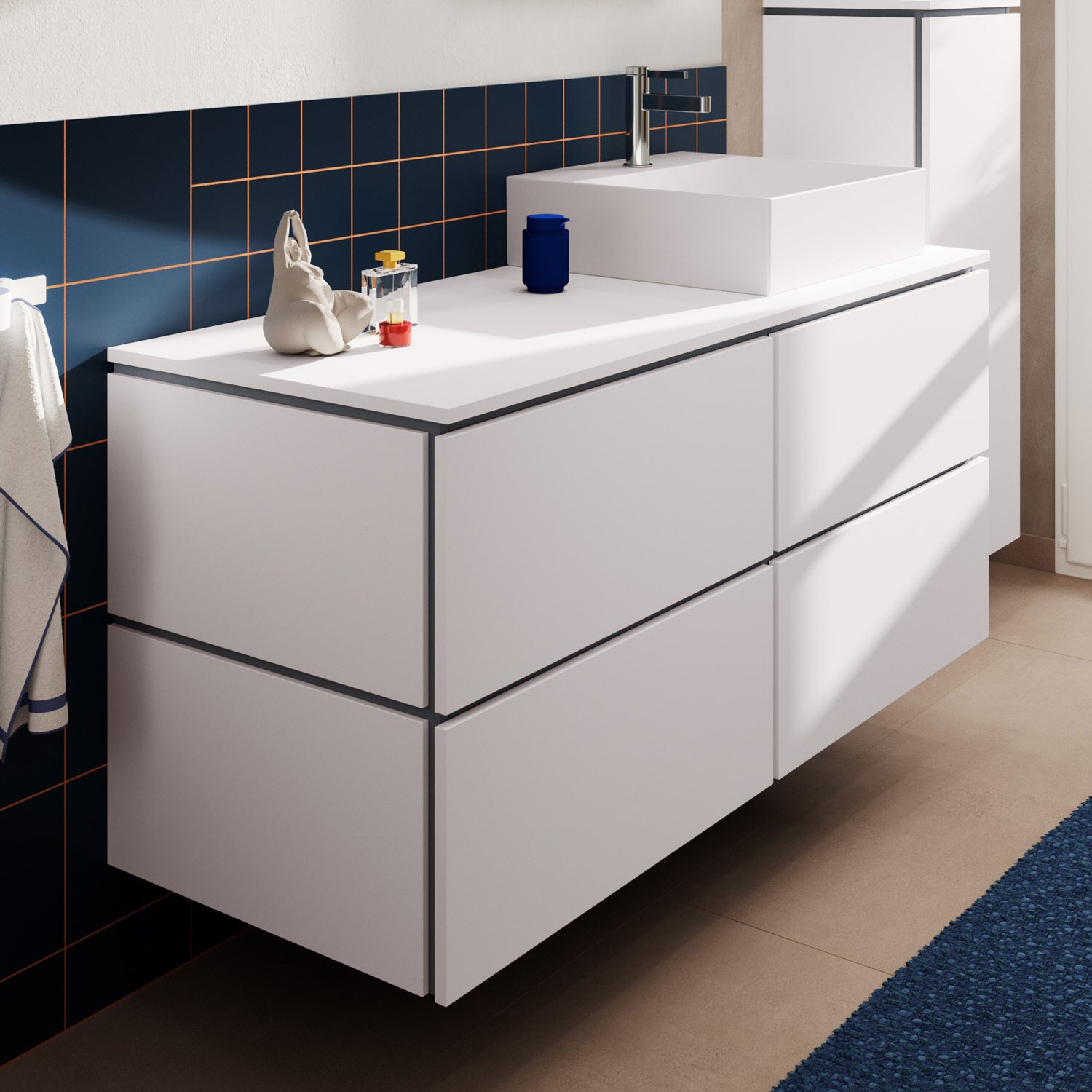 Entdecken Sie ein außergewöhnliches Design-Highlight für Ihr Bad, das nicht die Welt kostet. Mit Badmöbeln der hansgrohe Serie Xilesa E gestalten Sie im Handumdrehen Ihre persönliche Wohlfühloase. Die angebotene Waschtisch-/Konsolenplatte wird mit einem passenden Unterschrank und einem geschliffenen Aufsatzwaschtisch von hansgrohe kombiniert. Durch den Ausschnitt auf der rechten Seite bietet sie links viel Platz für Badutensilien und Pflegeprodukte.