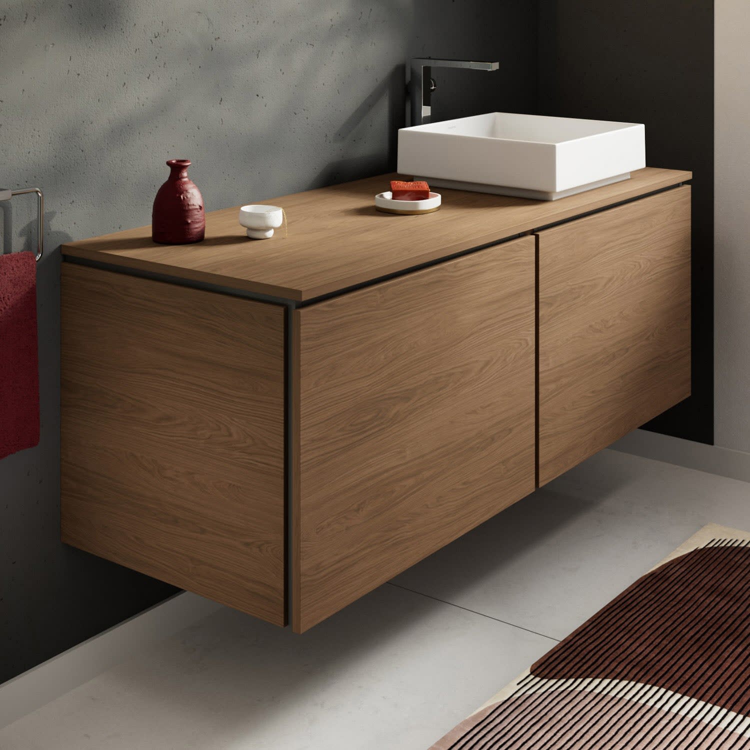 Die Waschtisch-/Konsolenplatte selbst besteht aus einer hochdichten Dreischichtholzspanplatte und ist wie alle hansgrohe Badmöbel hervorragend für die feuchte Umgebung im Bad geeignet. Tipp: Mit der hansgrohe Möbelserie Xilesa E können Sie Ihr Bad ganz nach Ihren Vorstellungen einrichten. Denn es gibt die Waschtisch-/Konsolenplatte in verschiedenen Varianten – auf Wunsch auch für ein geschliffenes Waschbecken, mit zwei Ausschnitten oder mit einem Ausschnitt auf der linken Seite.