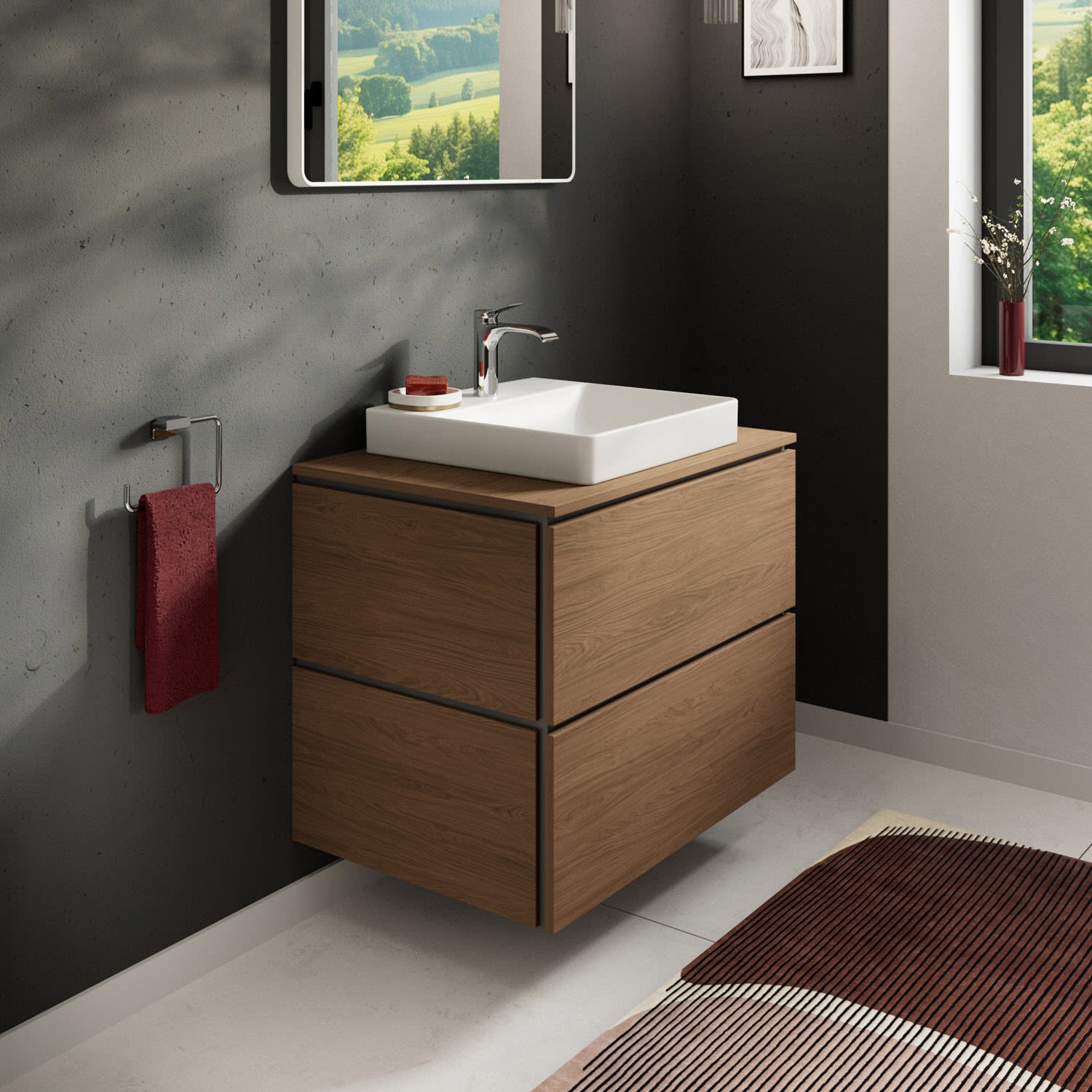 Die Waschtisch-/Konsolenplatte selbst besteht aus einer hochdichten Dreischichtholzspanplatte und ist wie alle hansgrohe Badmöbel hervorragend für die feuchte Umgebung im Bad geeignet. Tipp: Mit der hansgrohe Möbelserie Xilesa E können Sie Ihr Bad ganz nach Ihren Vorstellungen einrichten. Denn es gibt die Waschtisch-/Konsolenplatte in verschiedenen Varianten – auf Wunsch auch für eine ungeschliffene Waschschüssel.