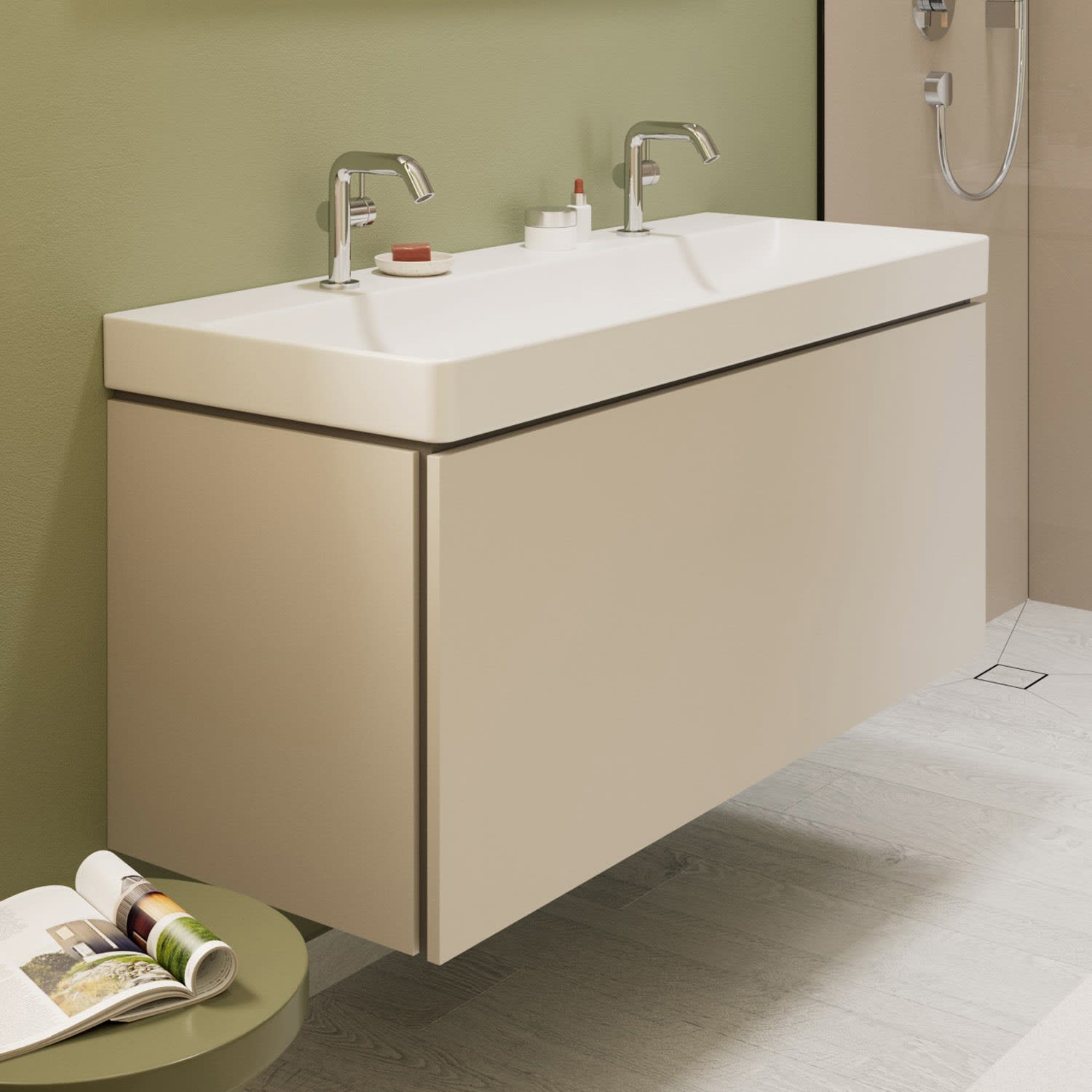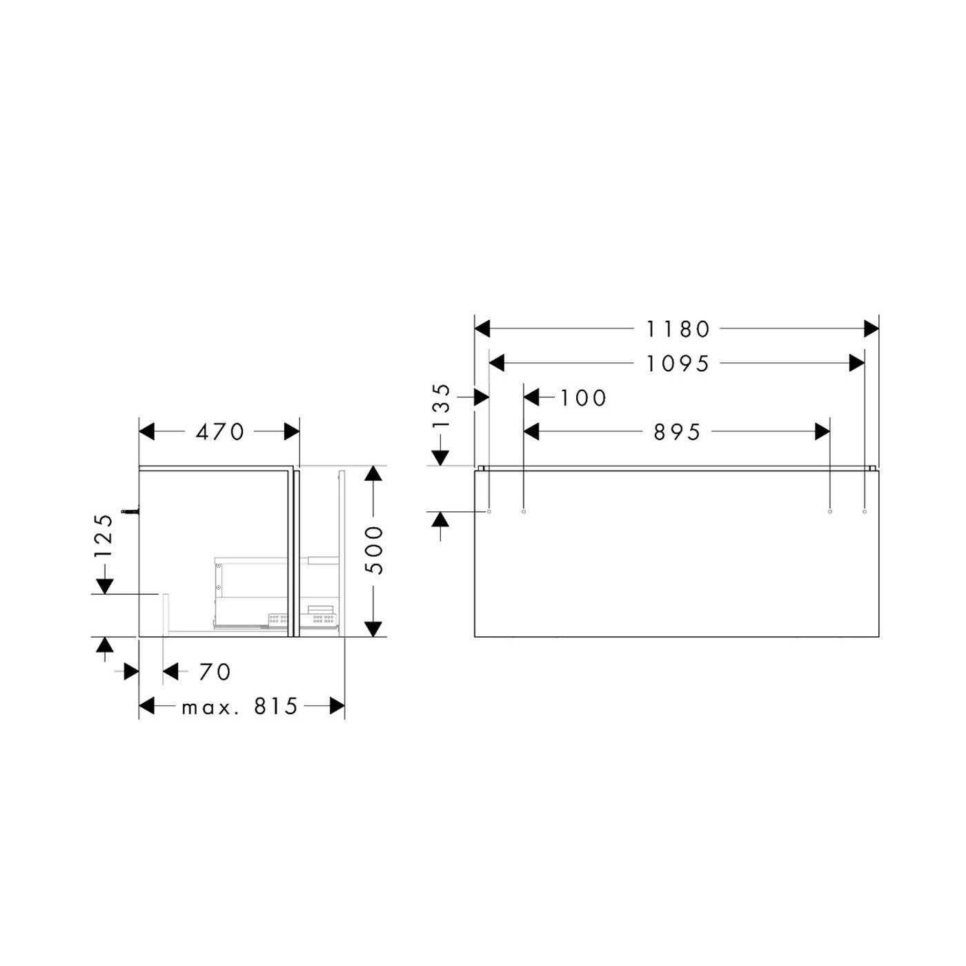 hansgrohe Xilesa E verbindet Design und Funktion zu einem komfortablen und eindrucksvollen Gesamterlebnis. So lässt sich die Schublade über die elegante Schattenfuge einfach öffnen. Auf einen störenden Griff kann verzichtet werden. Der Unterschrank bietet zudem maximalen Stauraum, da er ohne Siphonausschnitt auskommt – ein Raumsparsiphon macht's möglich.