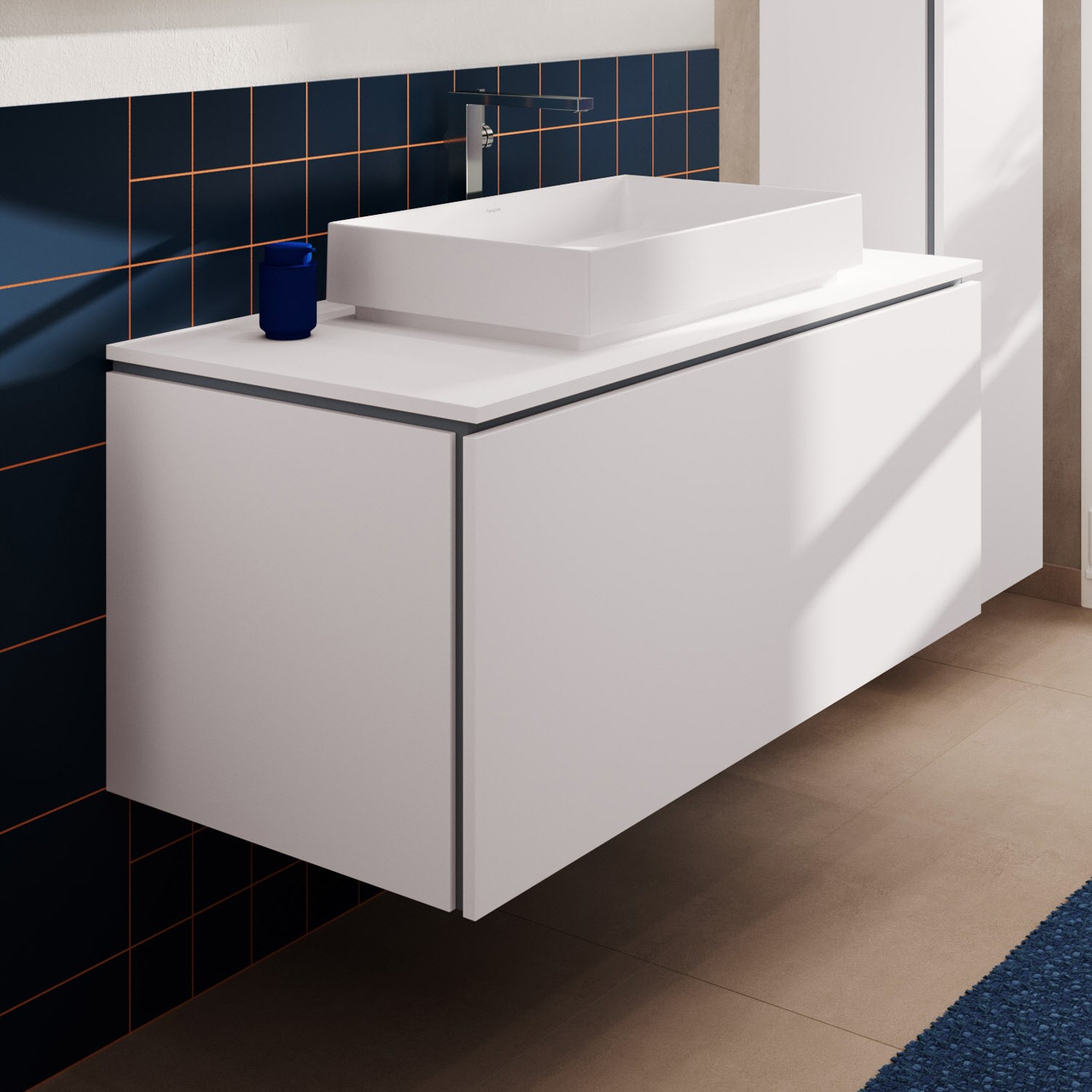 hansgrohe Xilesa E verbindet Design und Funktion zu einem komfortablen und eindrucksvollen Gesamterlebnis. So lässt sich die Schublade über die elegante Schattenfuge einfach öffnen. Auf einen störenden Griff kann verzichtet werden. Der Unterschrank bietet zudem maximalen Stauraum, da er ohne Siphonausschnitt auskommt – ein Raumsparsiphon macht's möglich.