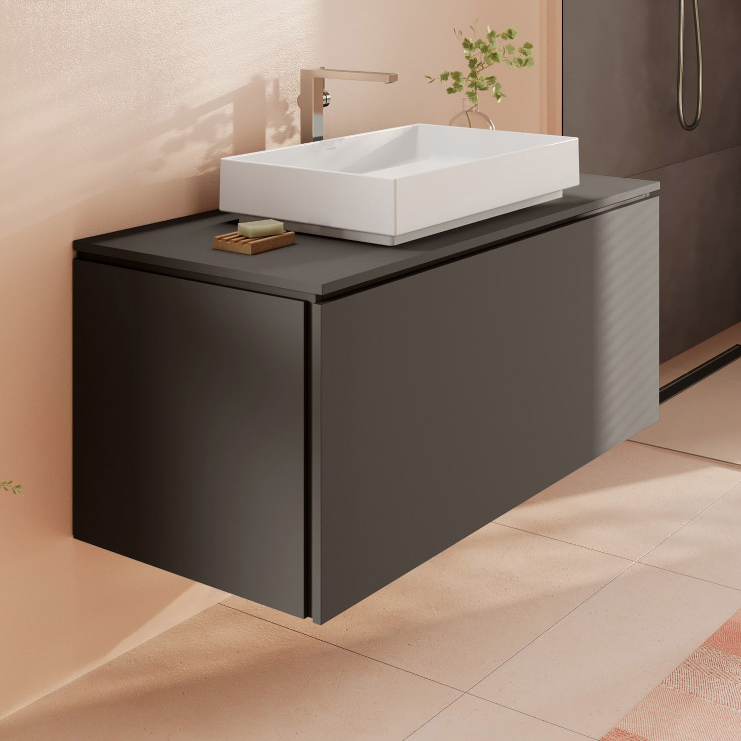 hansgrohe Xilesa E verbindet Design und Funktion zu einem komfortablen und eindrucksvollen Gesamterlebnis. So lässt sich die Schublade über die elegante Schattenfuge einfach öffnen. Auf einen störenden Griff kann verzichtet werden. Der Unterschrank bietet zudem maximalen Stauraum, da er ohne Siphonausschnitt auskommt – ein Raumsparsiphon macht's möglich.