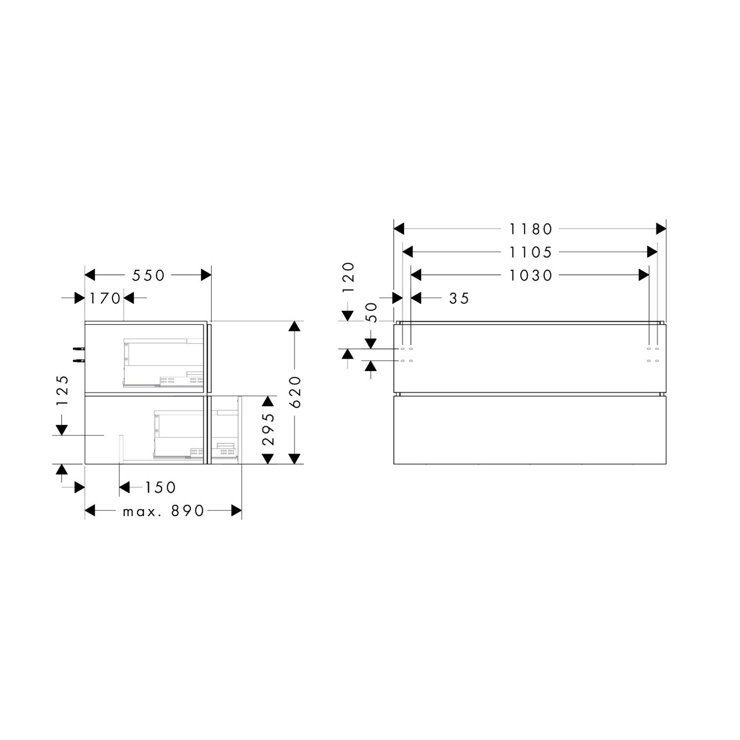 hansgrohe Xilesa E Waschtischunterschrank 118 cm mit 2 Auszügen für Konsole mit Ausschnitt mittig