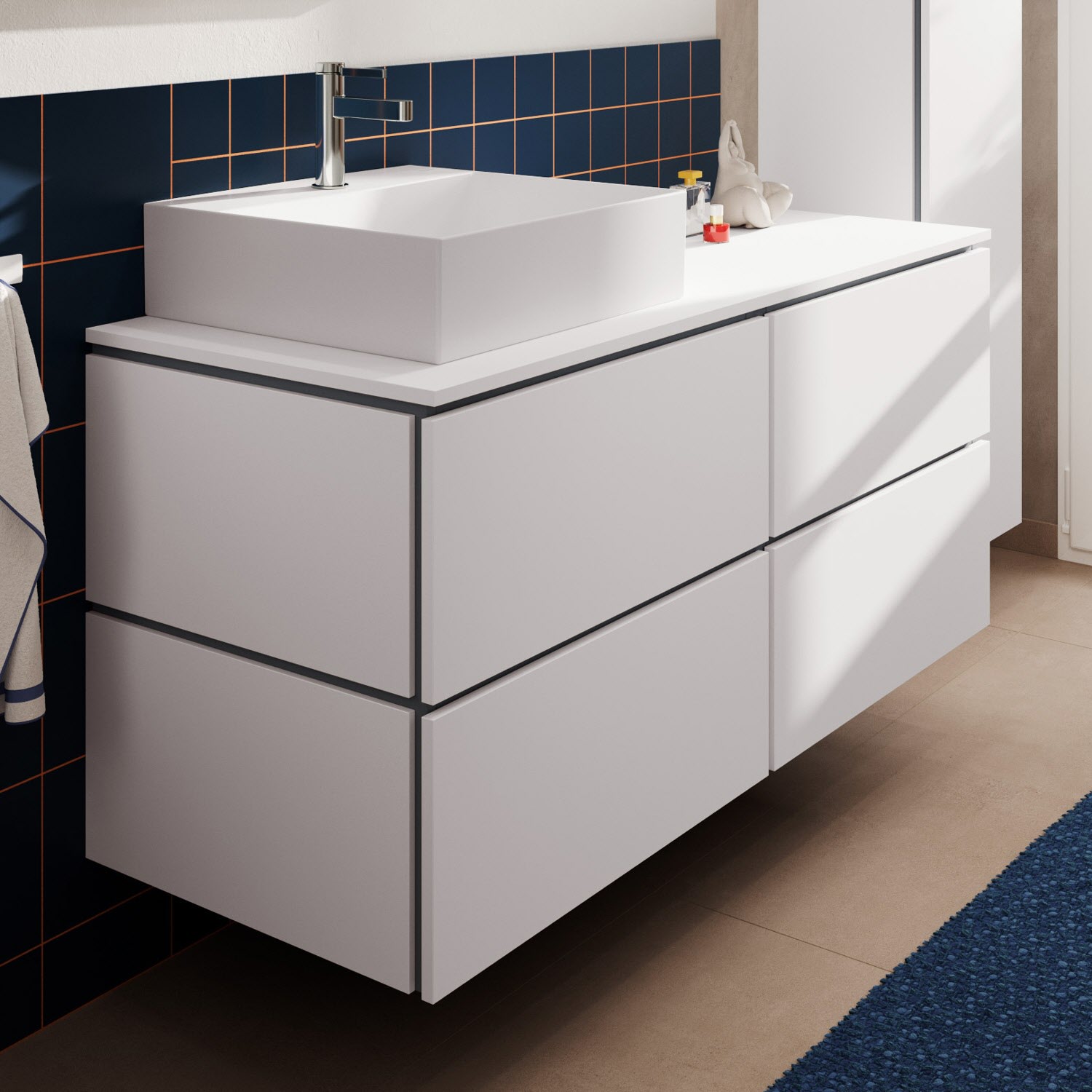 hansgrohe Xilesa E verbindet Design und Funktion zu einem komfortablen und eindrucksvollen Gesamterlebnis. So lassen sich die Schubladen über die elegante Schattenfuge einfach öffnen. Auf einen störenden Griff kann verzichtet werden. Der Unterschrank bietet zudem maximalen Stauraum, da er ohne Siphonausschnitt auskommt – ein Raumsparsiphon macht's möglich.