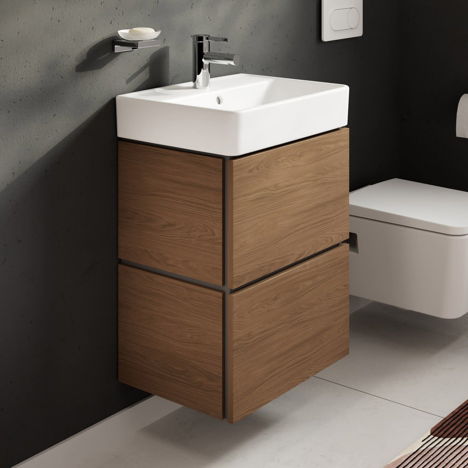 hansgrohe Xilesa E verbindet Design und Funktion zu einem komfortablen und eindrucksvollen Gesamterlebnis. So lassen sich die Schubladen mit einer Push Open Funktion einfach öffnen. Auf einen störenden Griff kann verzichtet werden. Der kompakte Unterschrank für schmal geschnittene Bäder bietet zudem maximalen Stauraum, da er ohne Siphonausschnitt auskommt – ein Raumsparsiphon macht's möglich.