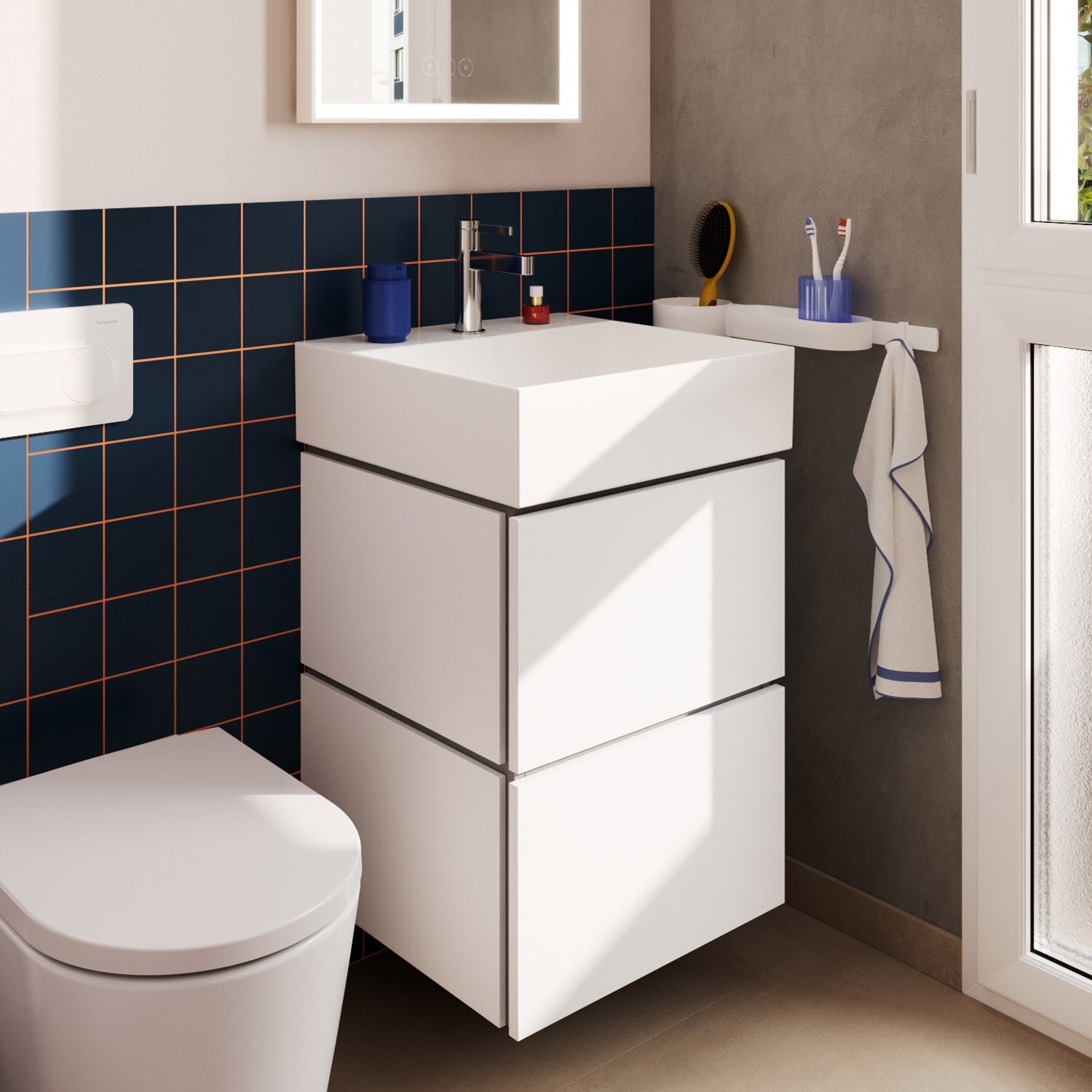 hansgrohe Xilesa E verbindet Design und Funktion zu einem komfortablen und eindrucksvollen Gesamterlebnis. So lassen sich die Schubladen mit einer Push-open-Funktion einfach öffnen. Auf einen störenden Griff kann verzichtet werden. Der Unterschrank bietet zudem maximalen Stauraum, da er ohne Siphonausschnitt auskommt – ein Raumsparsiphon macht's möglich.