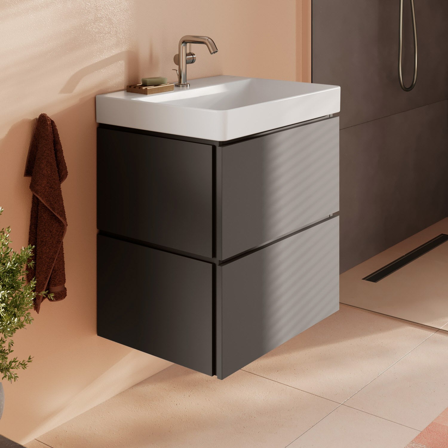 hansgrohe Xilesa E verbindet Design und Funktion zu einem komfortablen und eindrucksvollen Gesamterlebnis. So lassen sich die Schubladen mit einer Push-open-Funktion einfach öffnen. Auf einen störenden Griff kann verzichtet werden. Der Unterschrank bietet zudem maximalen Stauraum, da er ohne Siphonausschnitt auskommt – ein Raumsparsiphon macht's möglich.