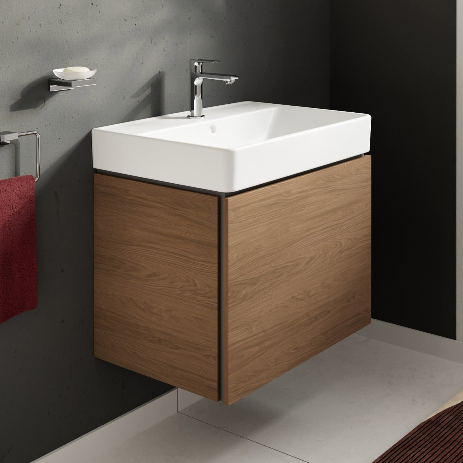 hansgrohe Xilesa E verbindet Design und Funktion zu einem komfortablen und eindrucksvollen Gesamterlebnis. So lässt sich die Schublade über die elegante Schattenfuge einfach öffnen. Auf einen störenden Griff kann verzichtet werden. Der Unterschrank bietet zudem maximalen Stauraum, da er ohne Siphonausschnitt auskommt – ein Raumsparsiphon macht's möglich.