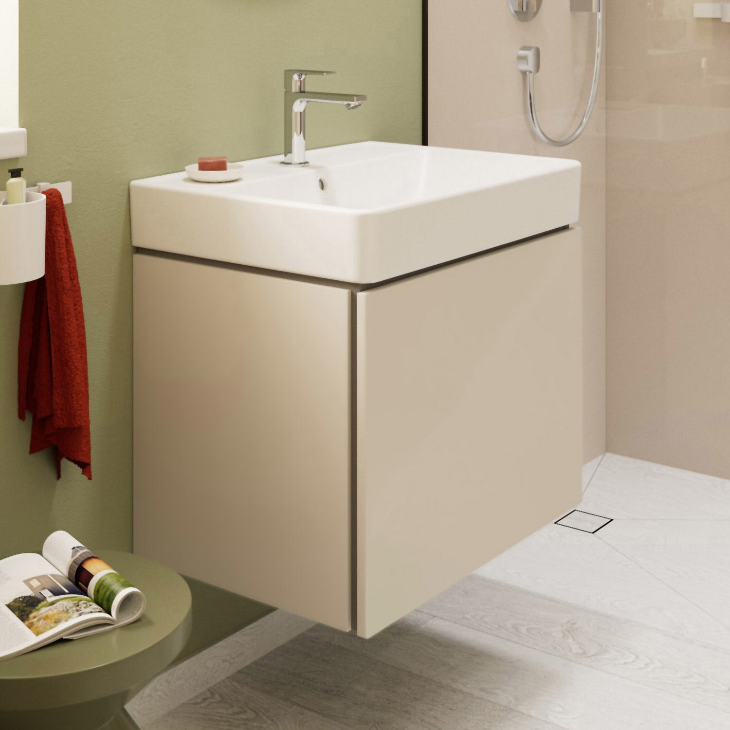 hansgrohe Xilesa E verbindet Design und Funktion zu einem komfortablen und eindrucksvollen Gesamterlebnis. So lässt sich die Schublade über die elegante Schattenfuge einfach öffnen. Auf einen störenden Griff kann verzichtet werden. Der Unterschrank bietet zudem maximalen Stauraum, da er ohne Siphonausschnitt auskommt – ein Raumsparsiphon macht's möglich.