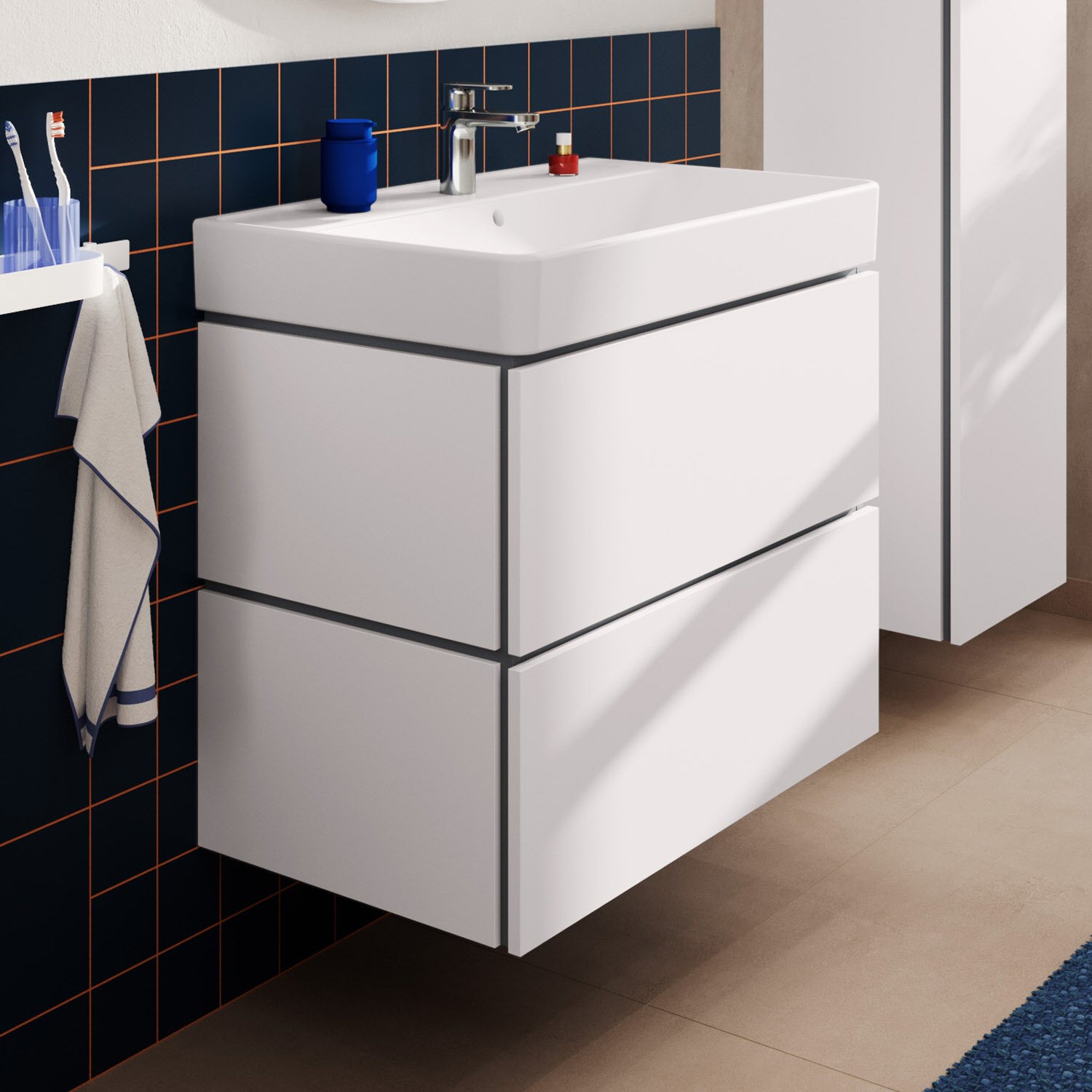 hansgrohe Xilesa E verbindet Design und Funktion zu einem komfortablen und eindrucksvollen Gesamterlebnis. So lässt sich die Schublade über die elegante Schattenfuge einfach öffnen. Auf einen störenden Griff kann verzichtet werden. Der Unterschrank bietet maximalen Stauraum, da er ohne Siphonausschnitt auskommt – ein Raumsparsiphon macht's möglich. Kombiniert mit weiteren Elementen von hansgrohe. Das aufeinander abgestimmte Design begründet ein harmonisches Zusammenspiel.