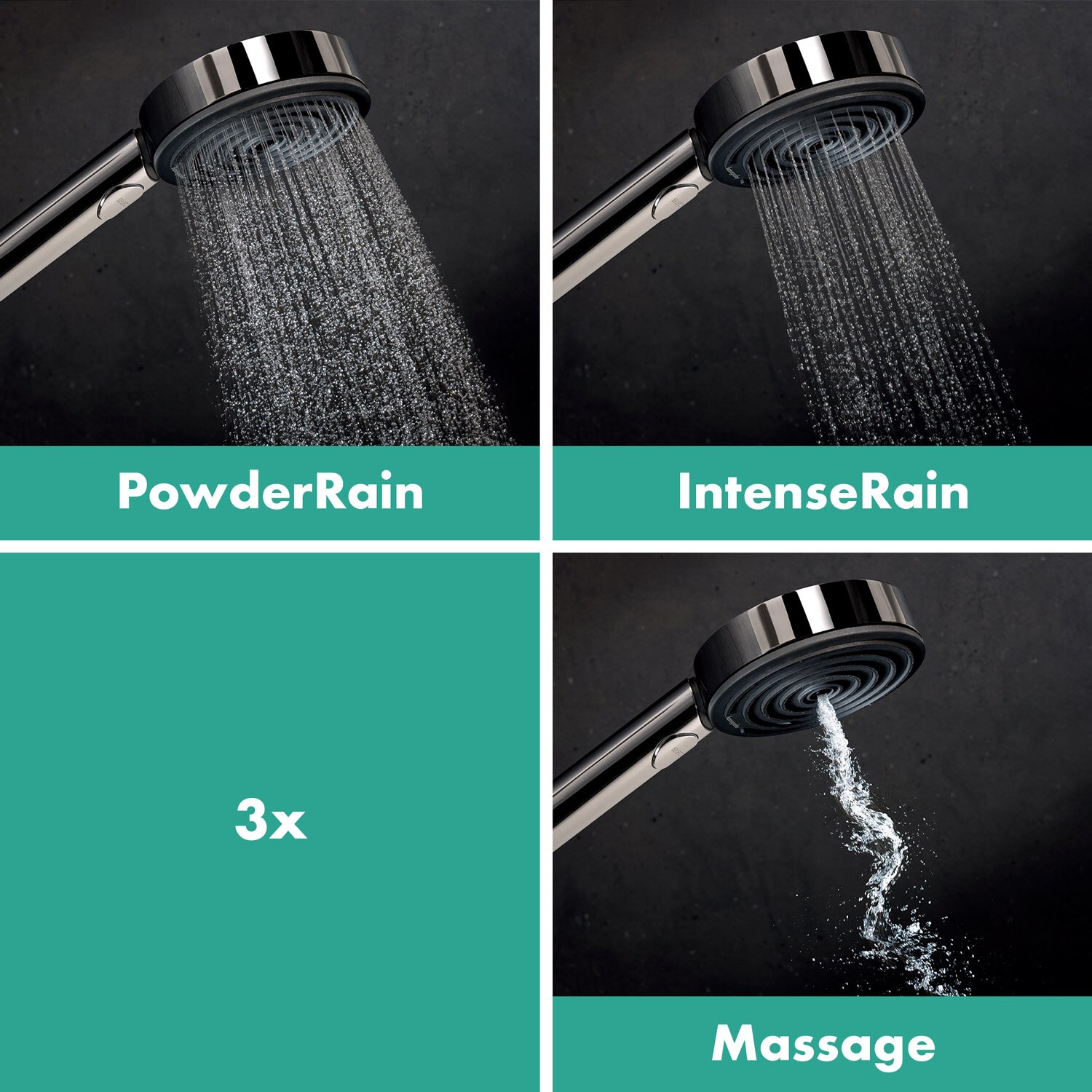 - Strahlart Kopfbrause: PowderRain, IntenseRain, Massagestrahl