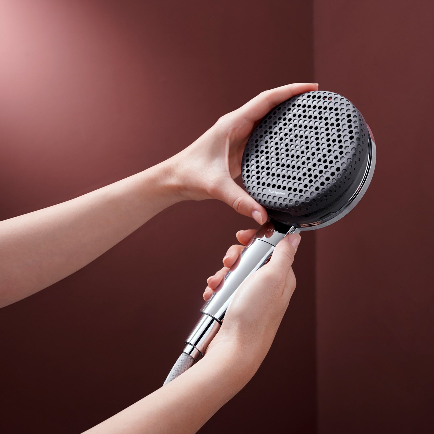 - Auch für kalkhaltiges Wasser geeignet: Die eloxierte Abdeckung lässt sich leicht abnehmen und reinigen. Darunter verborgene, flexible Düsen werden durch Abwischen von Rückständen befreit