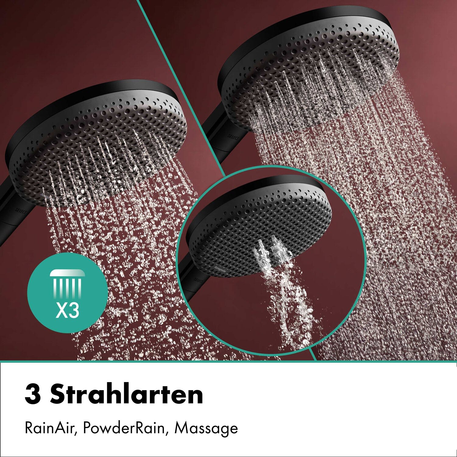 - Perfektes Doppel: Die Kopfbrause verwöhnt mit RainAir, während die Handbrause erstmals die beiden herausragenden hansgrohe Strahlarten RainAir und PowderRain in einer Brause vereint und mit einem wohltuenden Massagestrahl abrundet