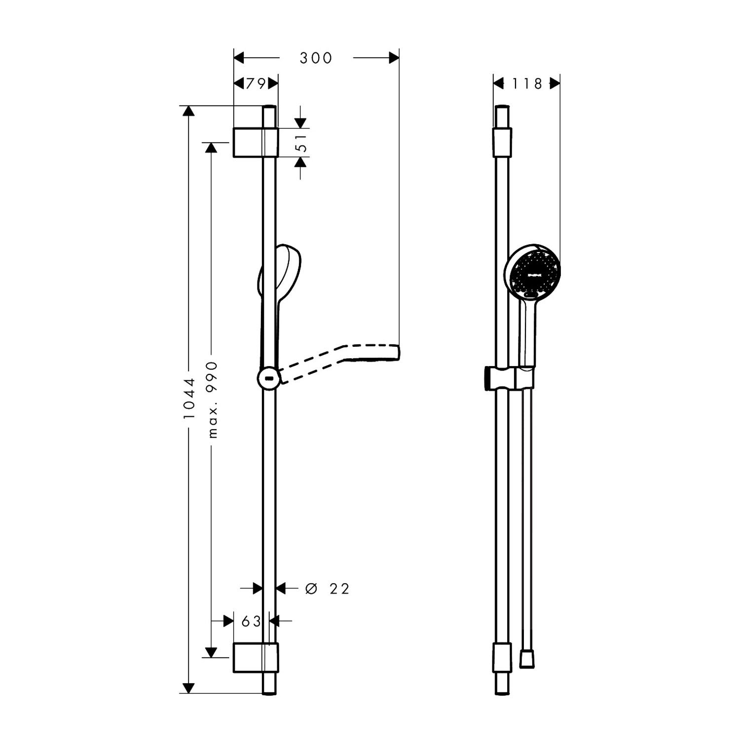 - Handbrausehalterung drehbar an der Stange für Links- oder Rechtsbetrieb