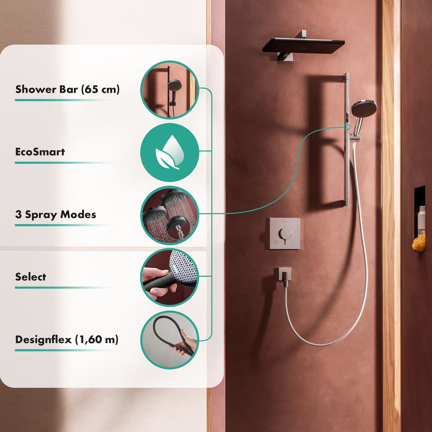 - *EcoSmart: Benötigt dank eines flexiblen Durchflussbegrenzers max. 8 l/min – ohne Einbußen beim Duschkomfort
