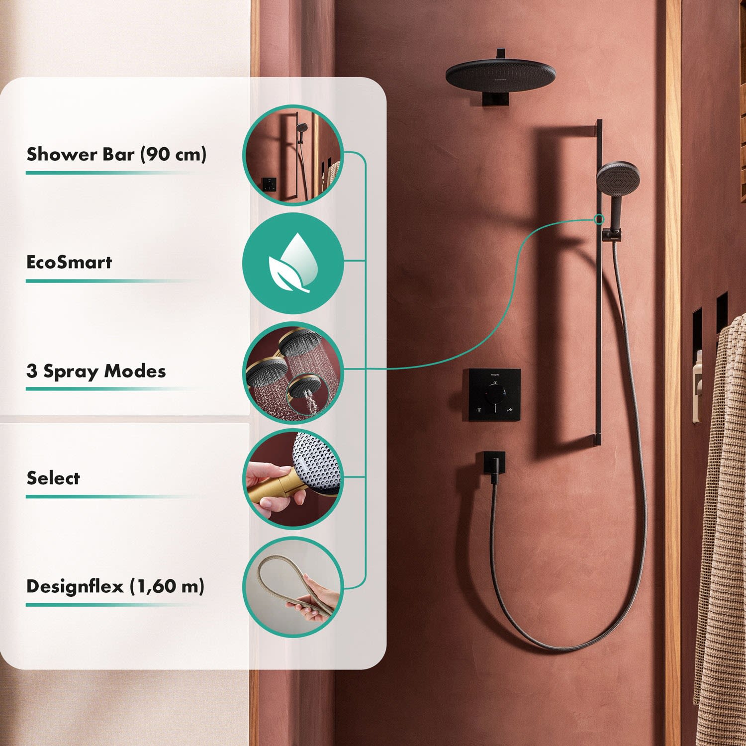 - *EcoSmart: Benötigt dank eines flexiblen Durchflussbegrenzers max. 8 l/min – ohne Einbußen beim Duschkomfort