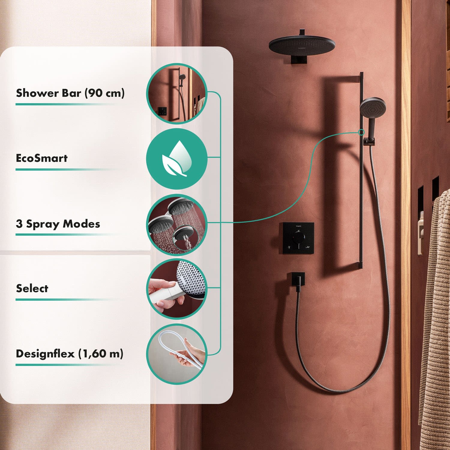 - *EcoSmart: Benötigt dank eines flexiblen Durchflussbegrenzers max. 8 l/min – ohne Einbußen beim Duschkomfort