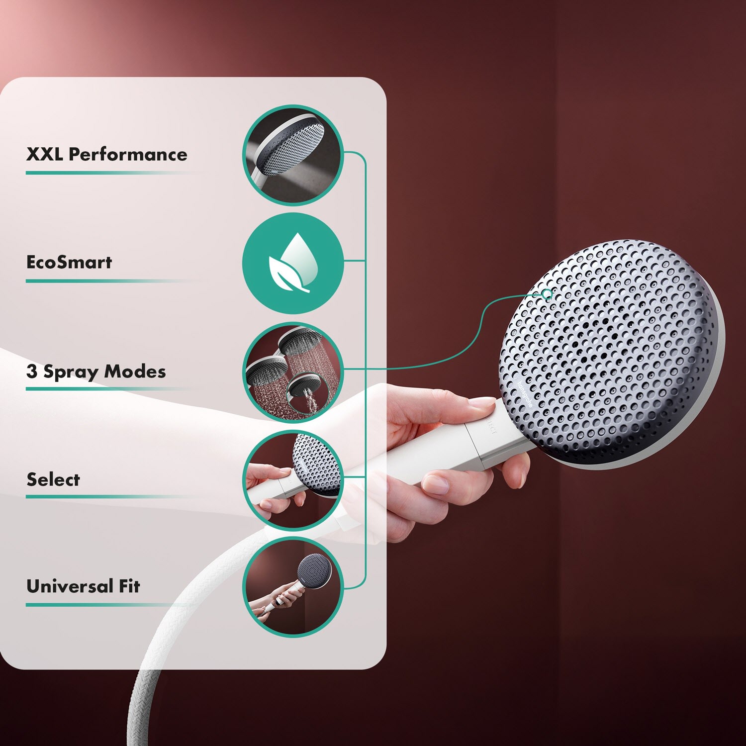 - *EcoSmart: Benötigt dank eines flexiblen Durchflussbegrenzers max. 8 l/min – ohne Einbußen beim Duschkomfort