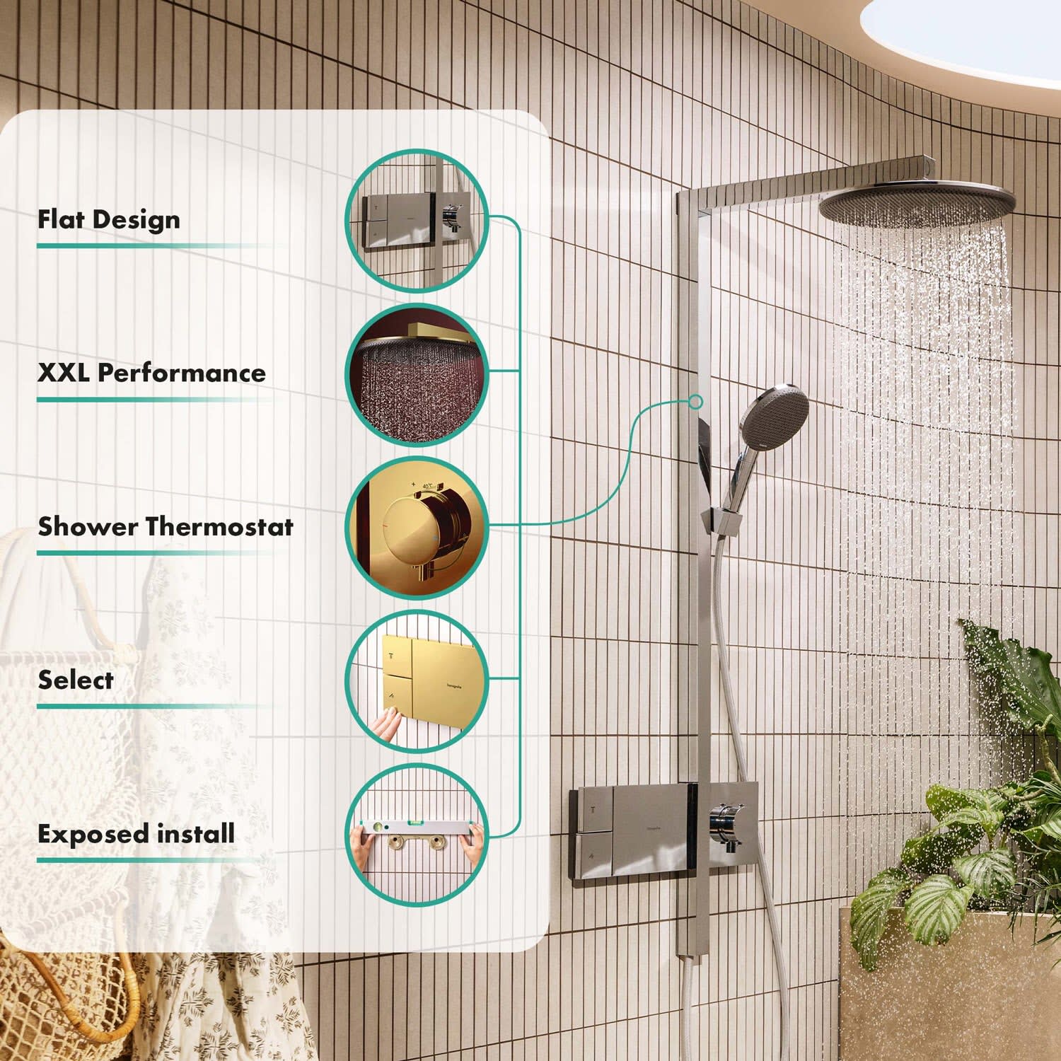 - Skulpturales Design – einfach eingebaut: Ihr hansgrohe Duschsystem wird von außen montiert (Aufputz). Die Wand bleibt unversehrt