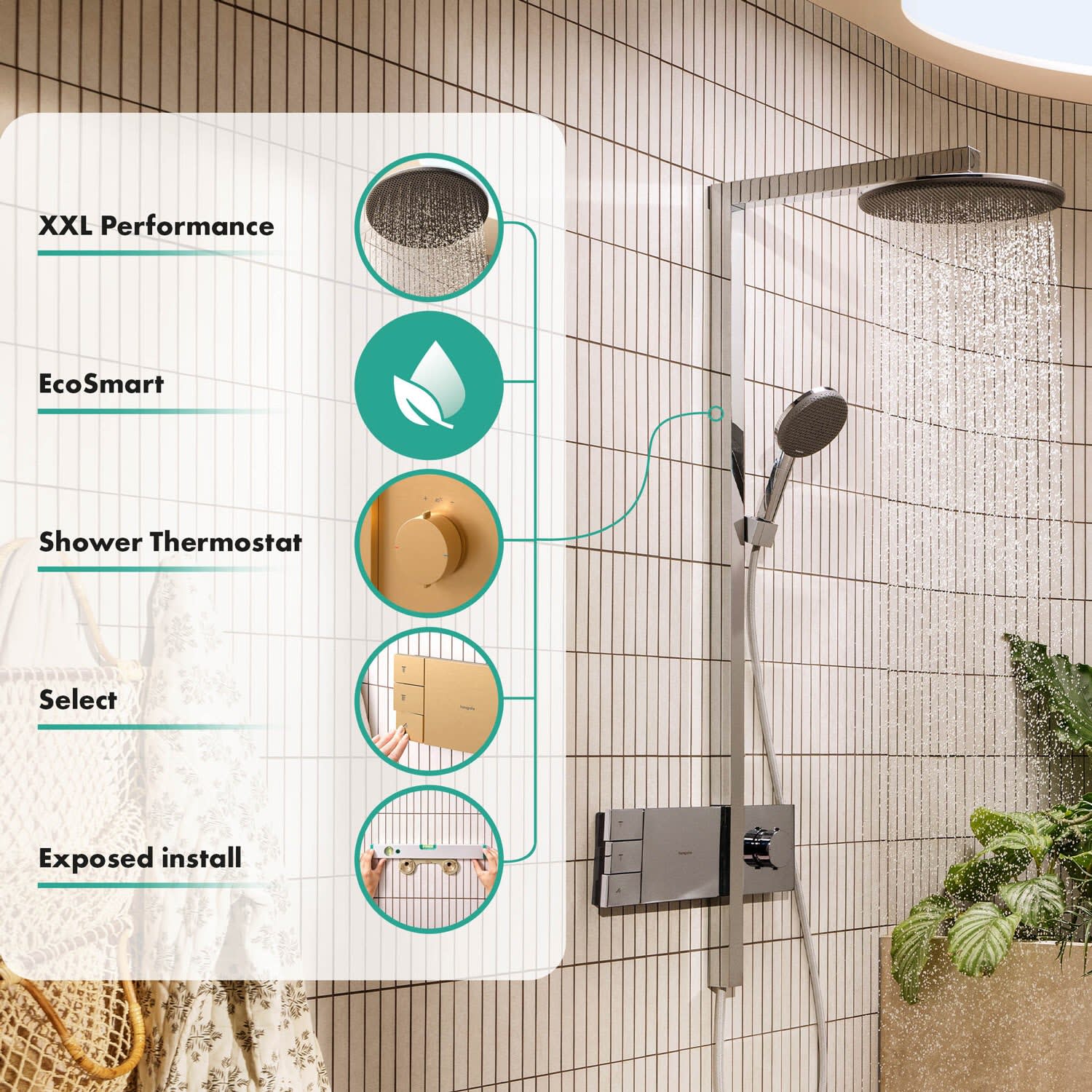 - *EcoSmart: Benötigt dank eines flexiblen Durchflussbegrenzers max. 8 l/min – ohne Einbußen beim Duschkomfort