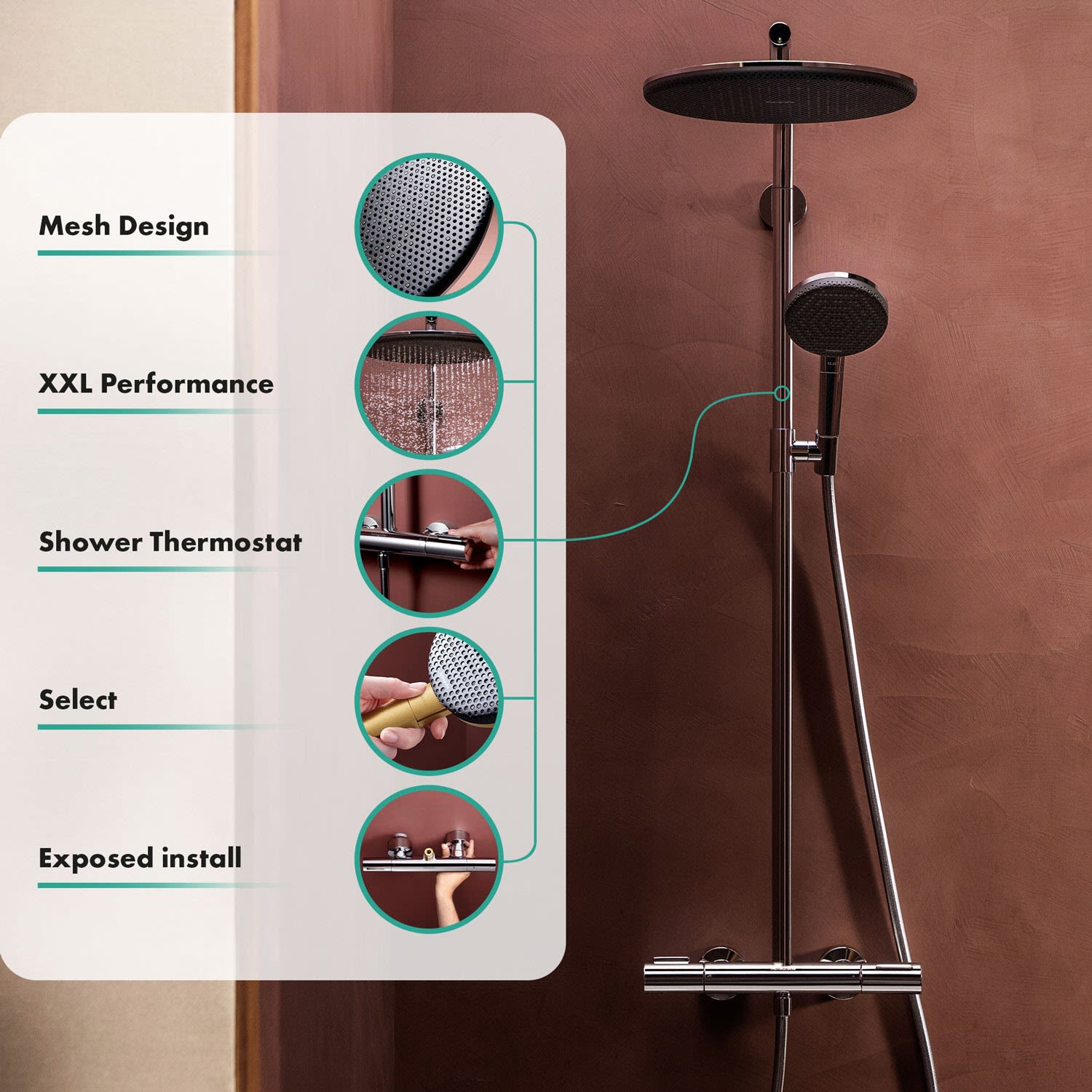 - Skulpturales Design – einfach eingebaut: Ihr hansgrohe Duschsystem wird von außen montiert (Aufputz). Die Wand bleibt unversehrt