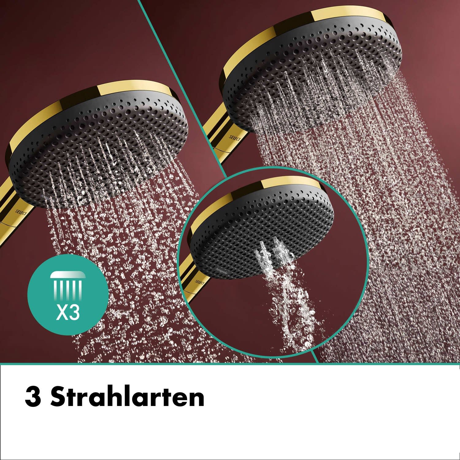 - Große Auswahl: Je nach Stimmung wählen Sie mit einem Tastendruck (Select) zwischen drei Strahlarten an der Handbrause. Die Kopfbrause verwöhnt mit der Strahlart RainAir – je nach Vorliebe können Sie alternativ auch hansgrohe PowderRain voreinstellen