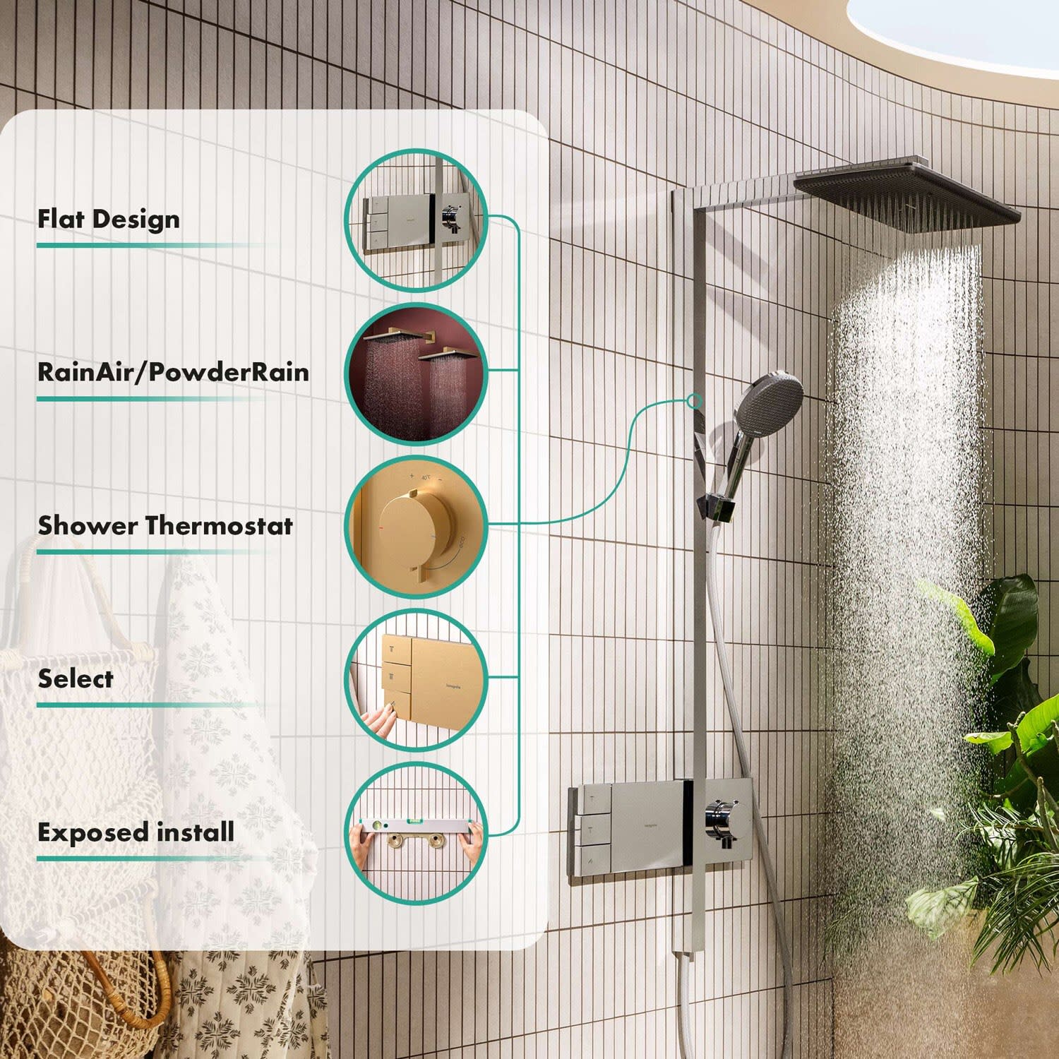 - Skulpturales Design – einfach eingebaut: Ihr hansgrohe Duschsystem wird von außen montiert (Aufputz). Die Wand bleibt unversehrt