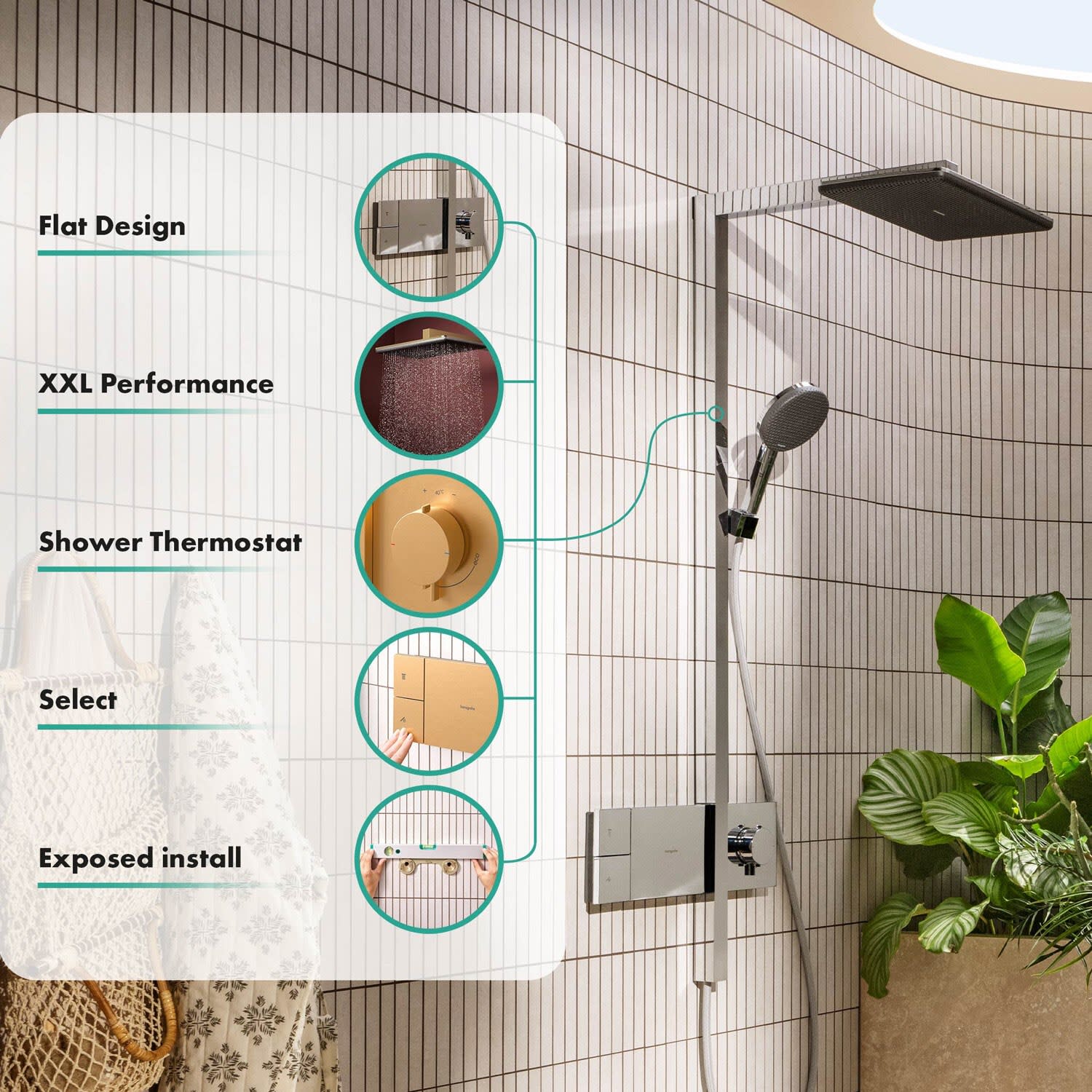 - Skulpturales Design – einfach eingebaut: Ihr hansgrohe Duschsystem wird von außen montiert (Aufputz). Die Wand bleibt unversehrt