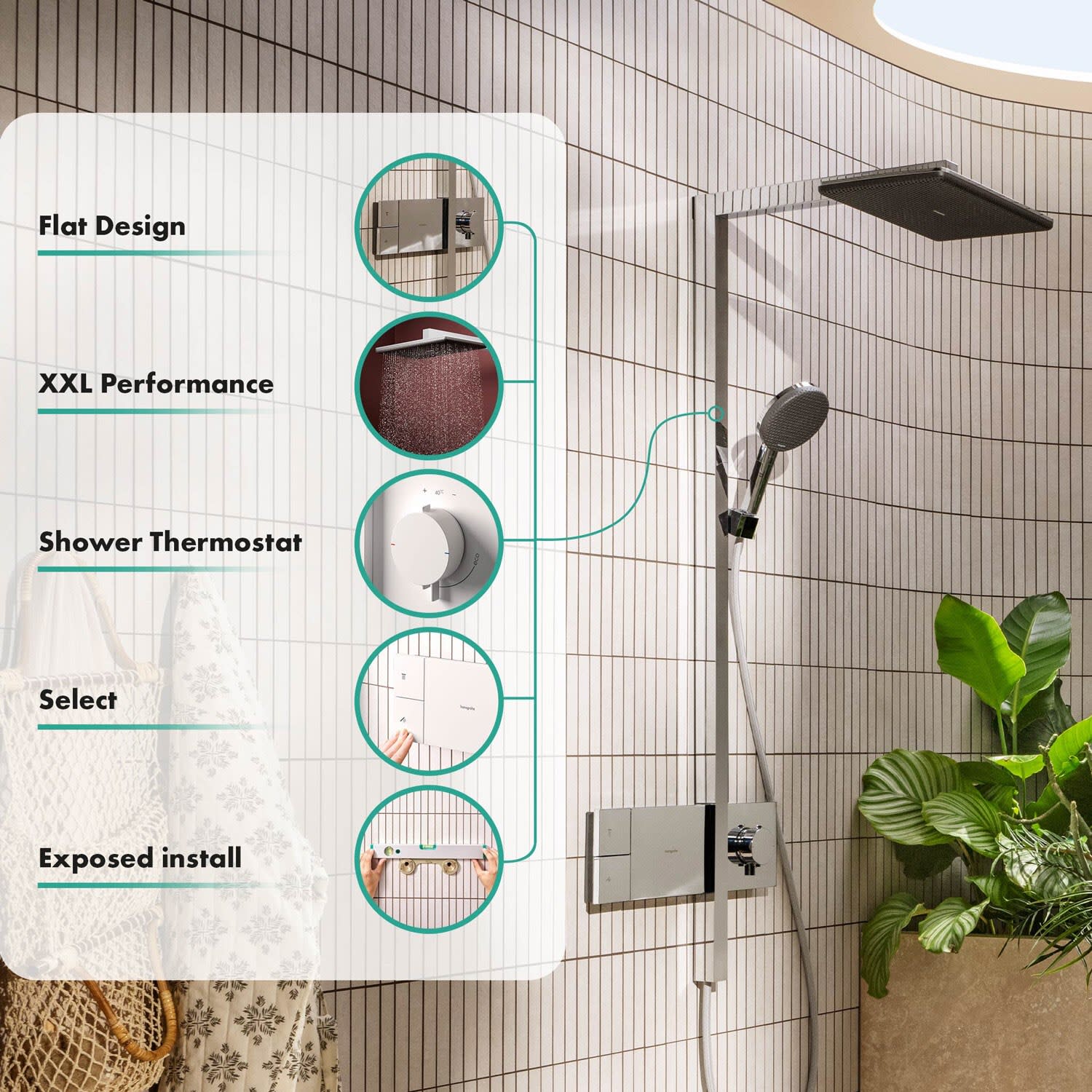 - Skulpturales Design – einfach eingebaut: Ihr hansgrohe Duschsystem wird von außen montiert (Aufputz). Die Wand bleibt unversehrt