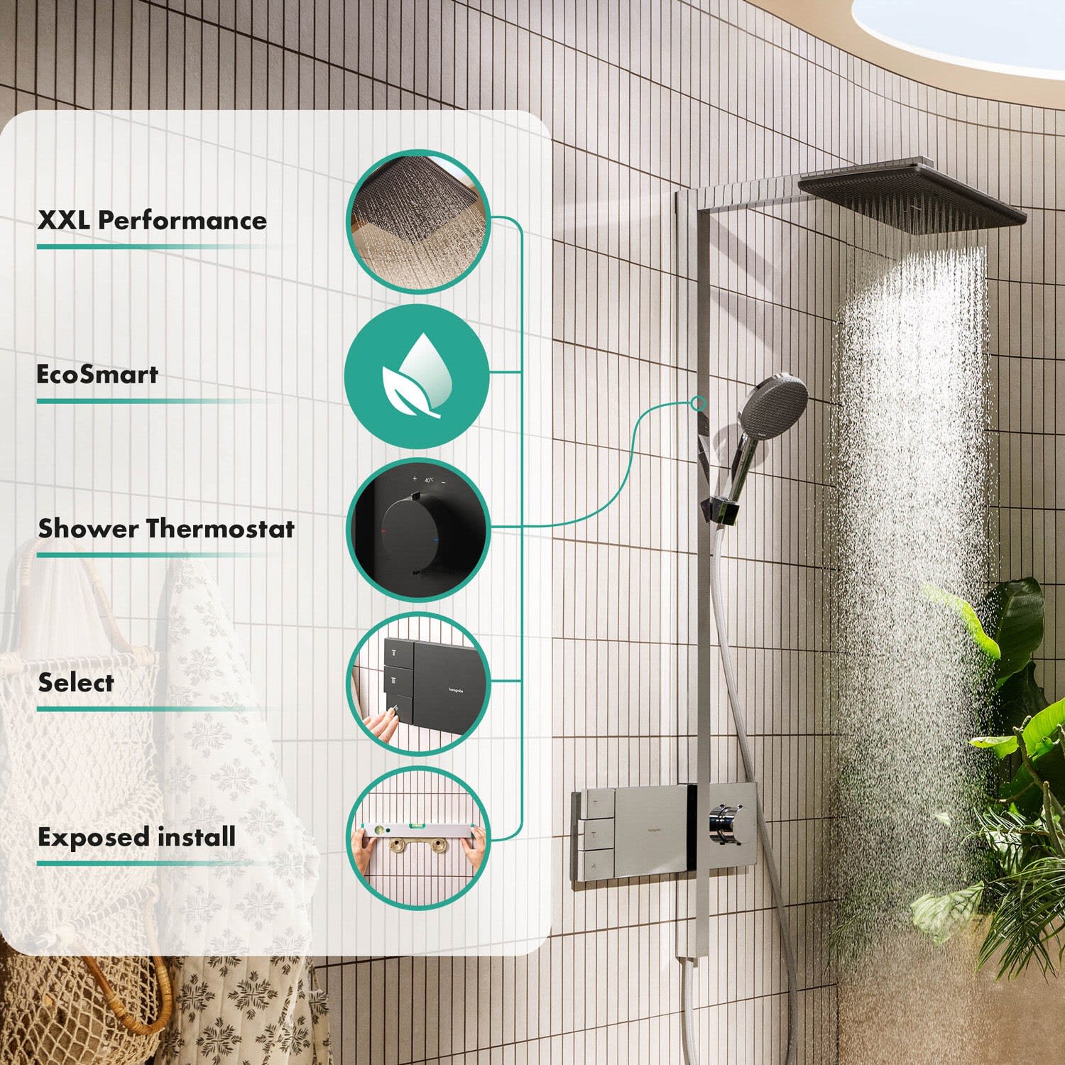 - *EcoSmart: Benötigt dank eines flexiblen Durchflussbegrenzers max. 8 l/min – ohne Einbußen beim Duschkomfort