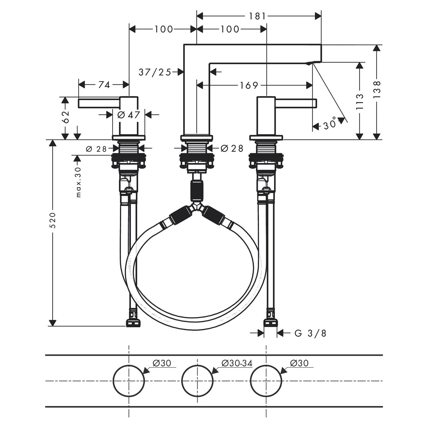 hansgrohe Finoris 3-Loch Waschtischarmatur 110 mit Push-Open Ablaufgarnitur