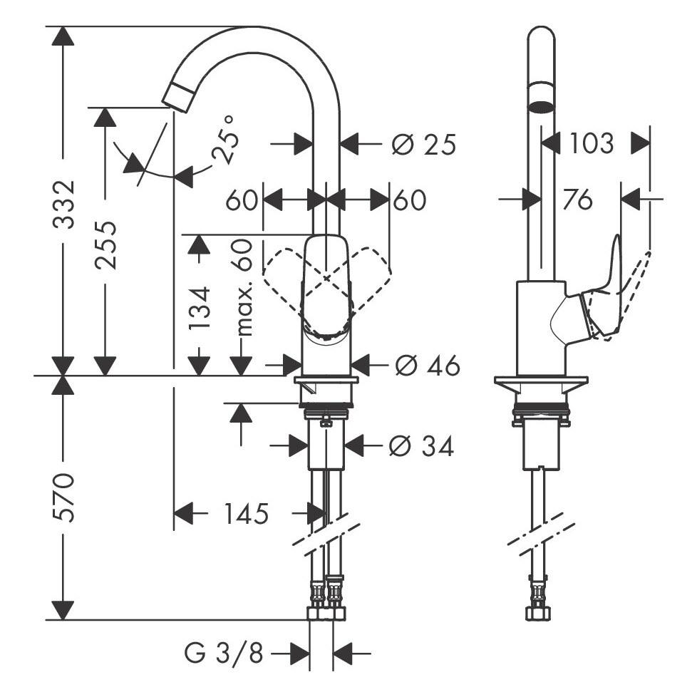 - flexibel: der Griff kann bei Montage wahlweise links oder rechts vom Auslauf positioniert werden
