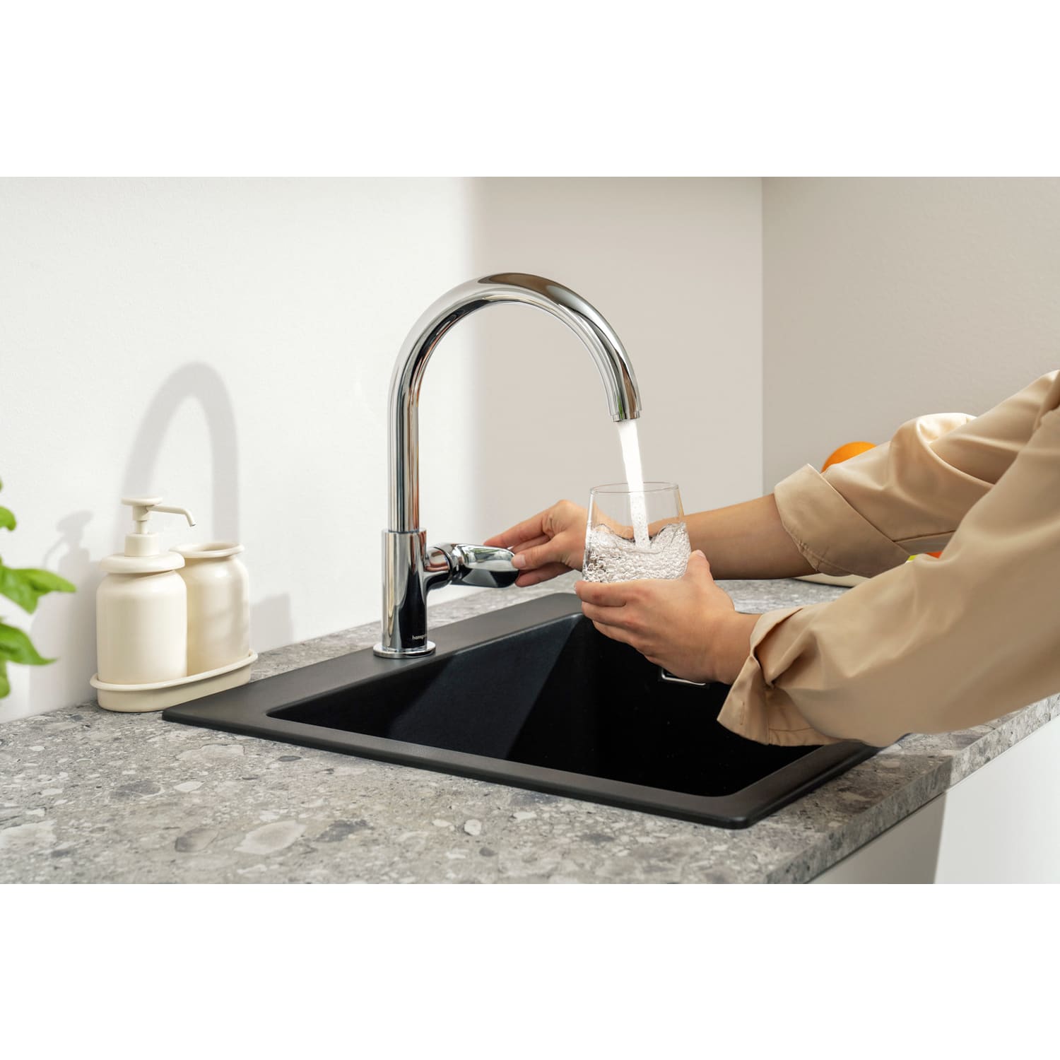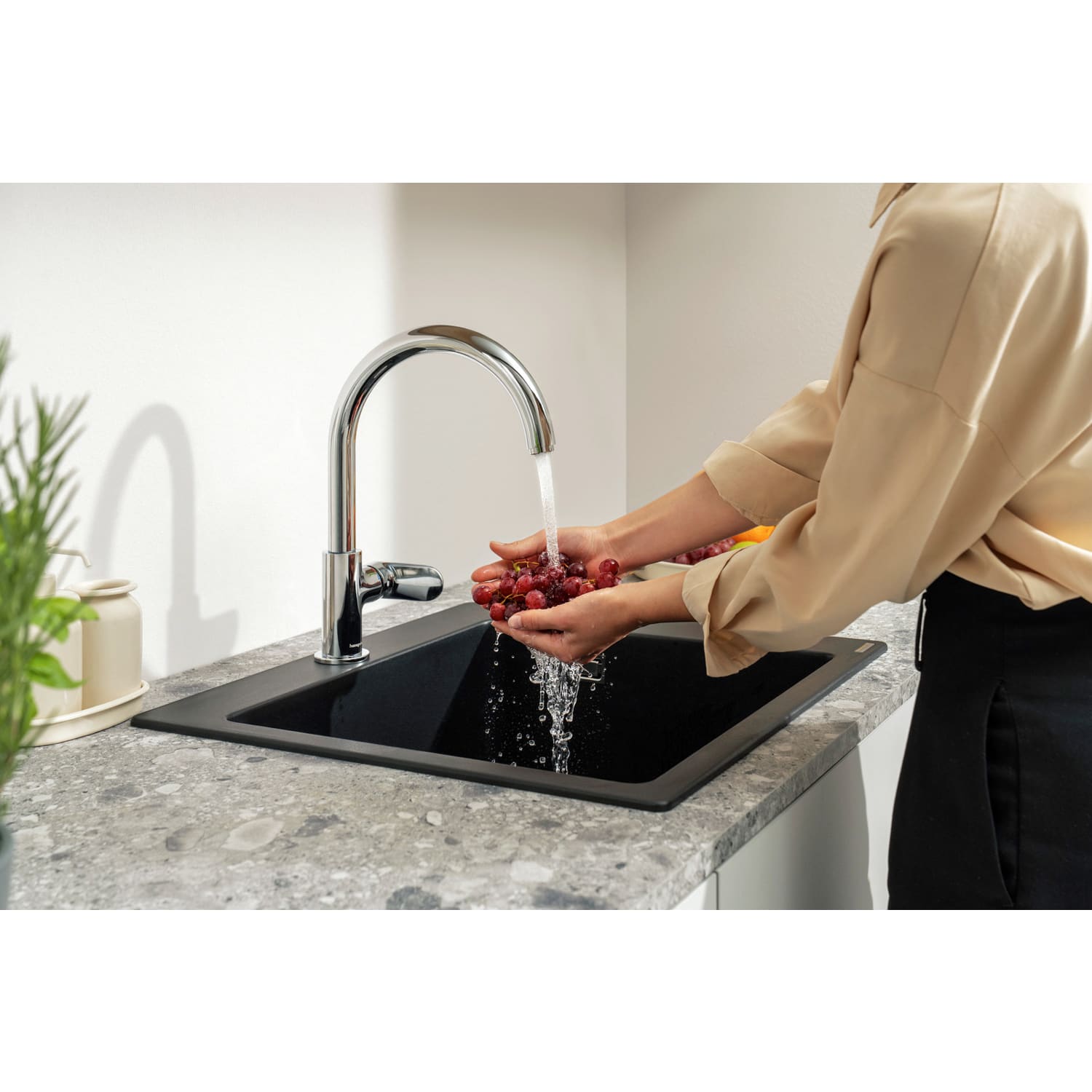 - mehr Bewegungsfreiheit: großer Abstand zwischen Auslauf und Spülbecken (ComfortZone 260) sowie in 3 Stufen einstellbarer Schwenkauslauf (110°, 150° oder 360°)