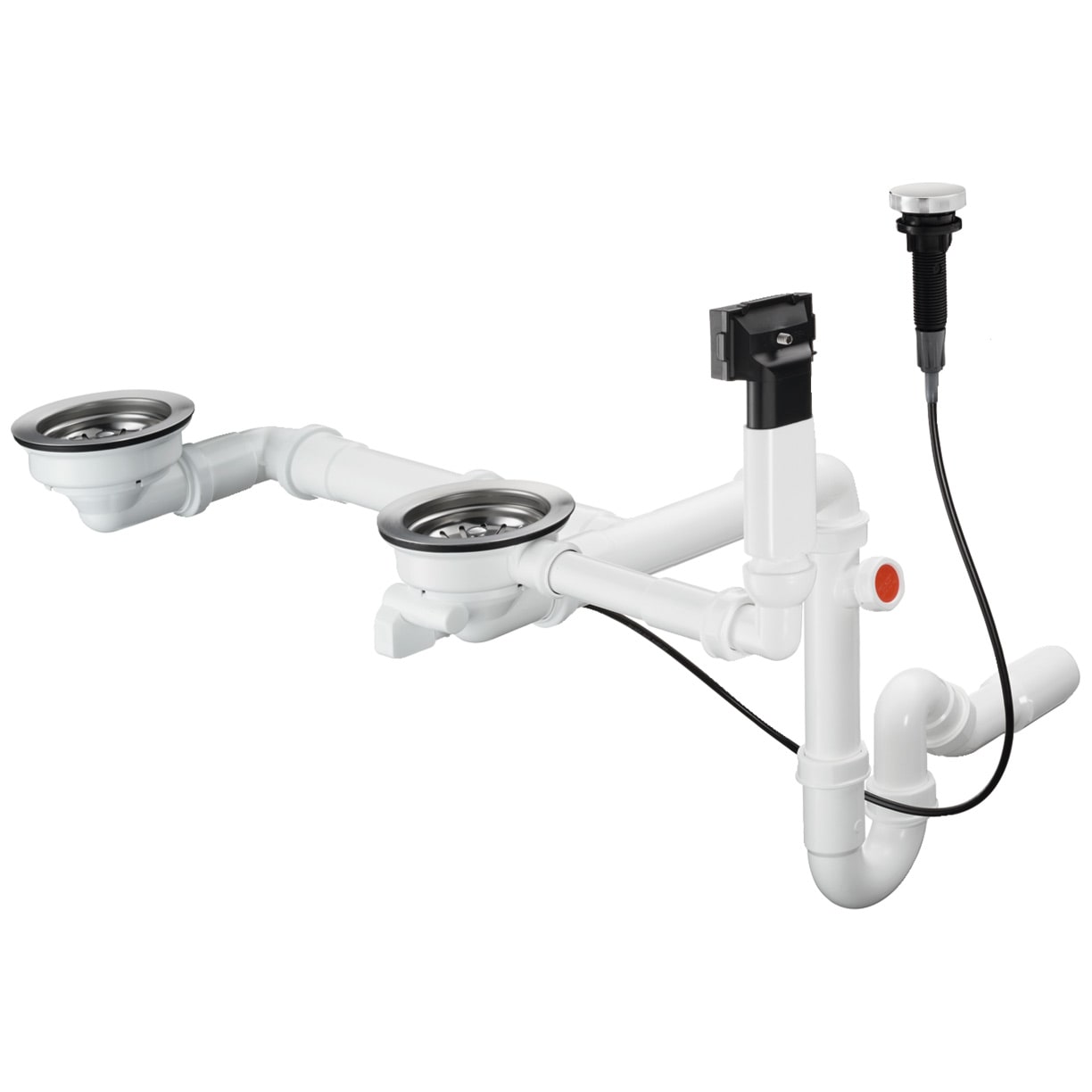 - Ablaufsystem: Ablaufbedienung des Hauptbeckens durch Drehen am Excenter, beim Zusatzbecken durch Drücken/Ziehen am Siebkorb